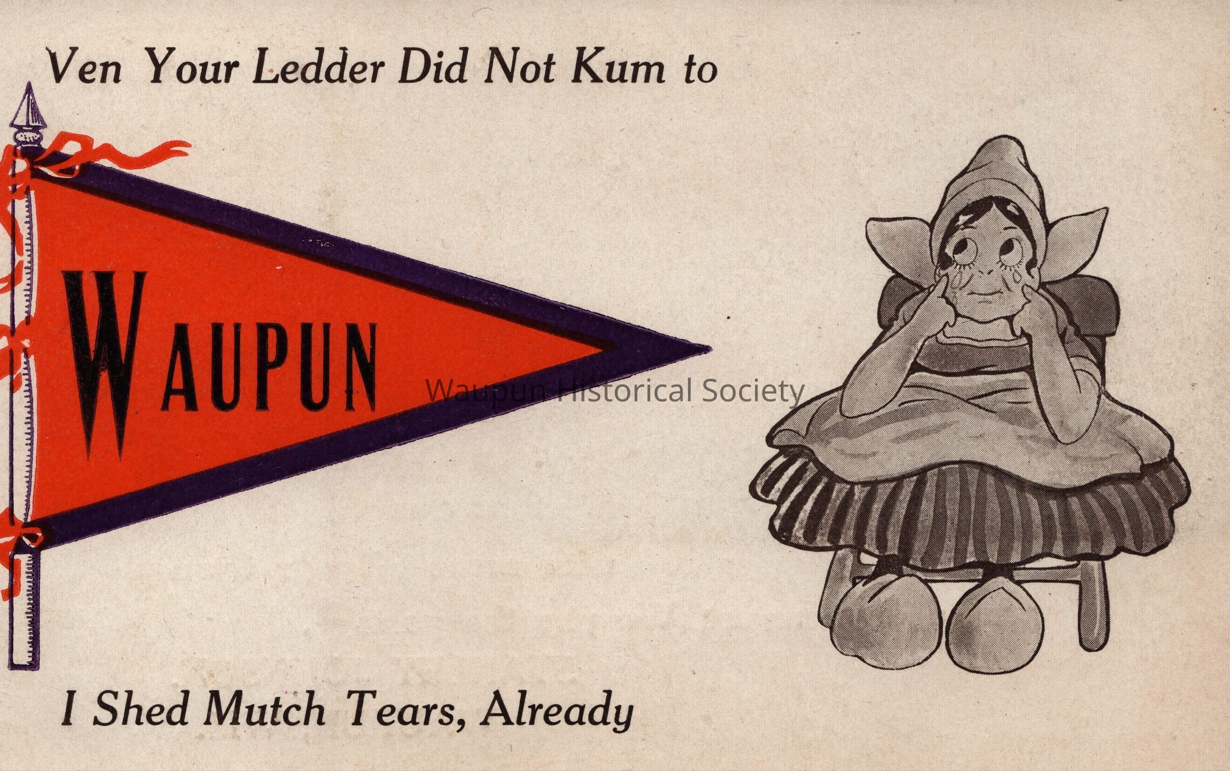 Postcard, Souvenir, Waupun, I Shed Much Tears, Already, Dutch Kids Pennant, Ven Your Ledder Did Not Kum to, Stanley JohnsonEntry/Object ID