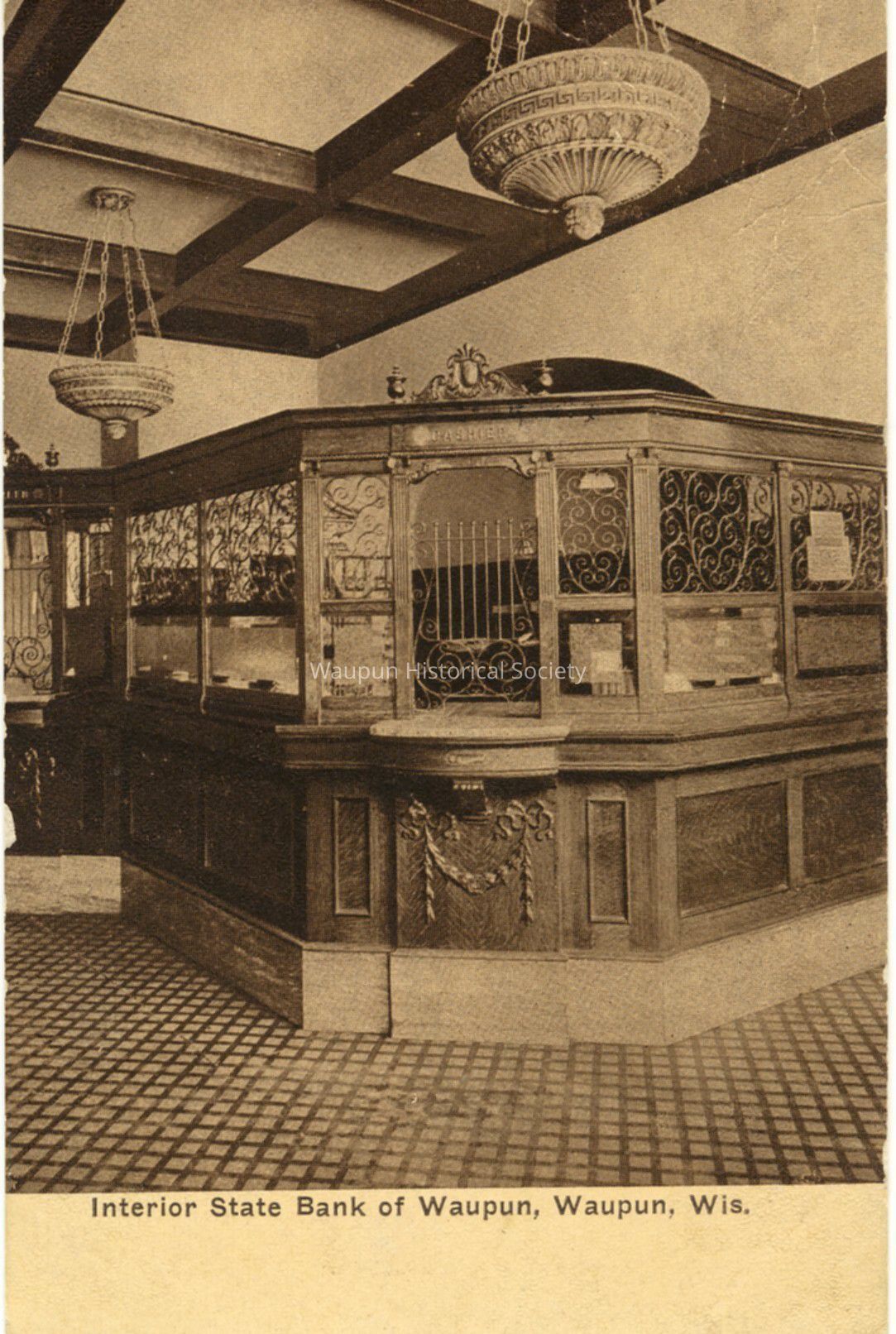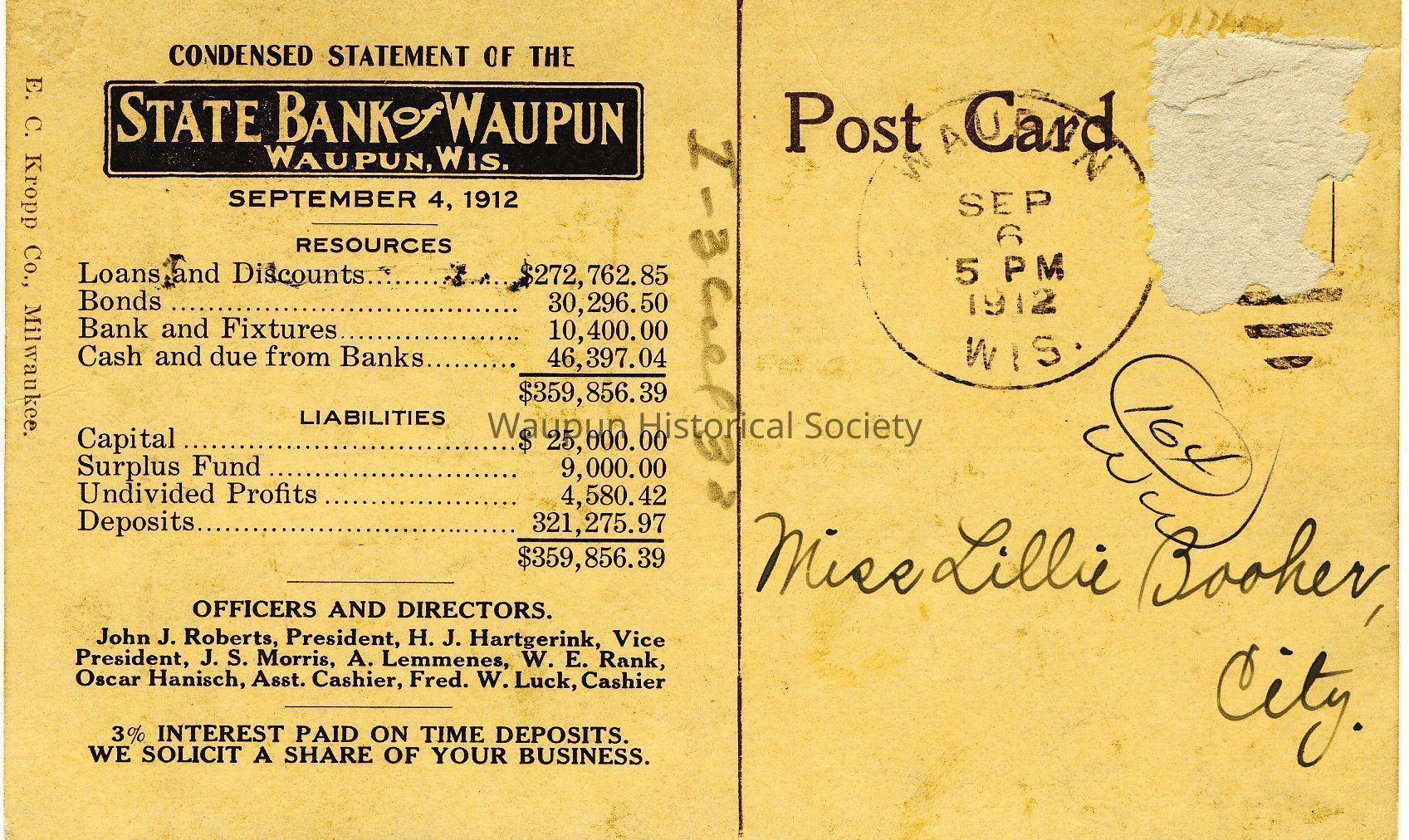 Colorized photo postcard of the Waupun state Bank. On reverse side is printed a "condensed statement of the State Bank of Waupun, Waupun Wisconsin as of Sept. 4, 1912Acquisition