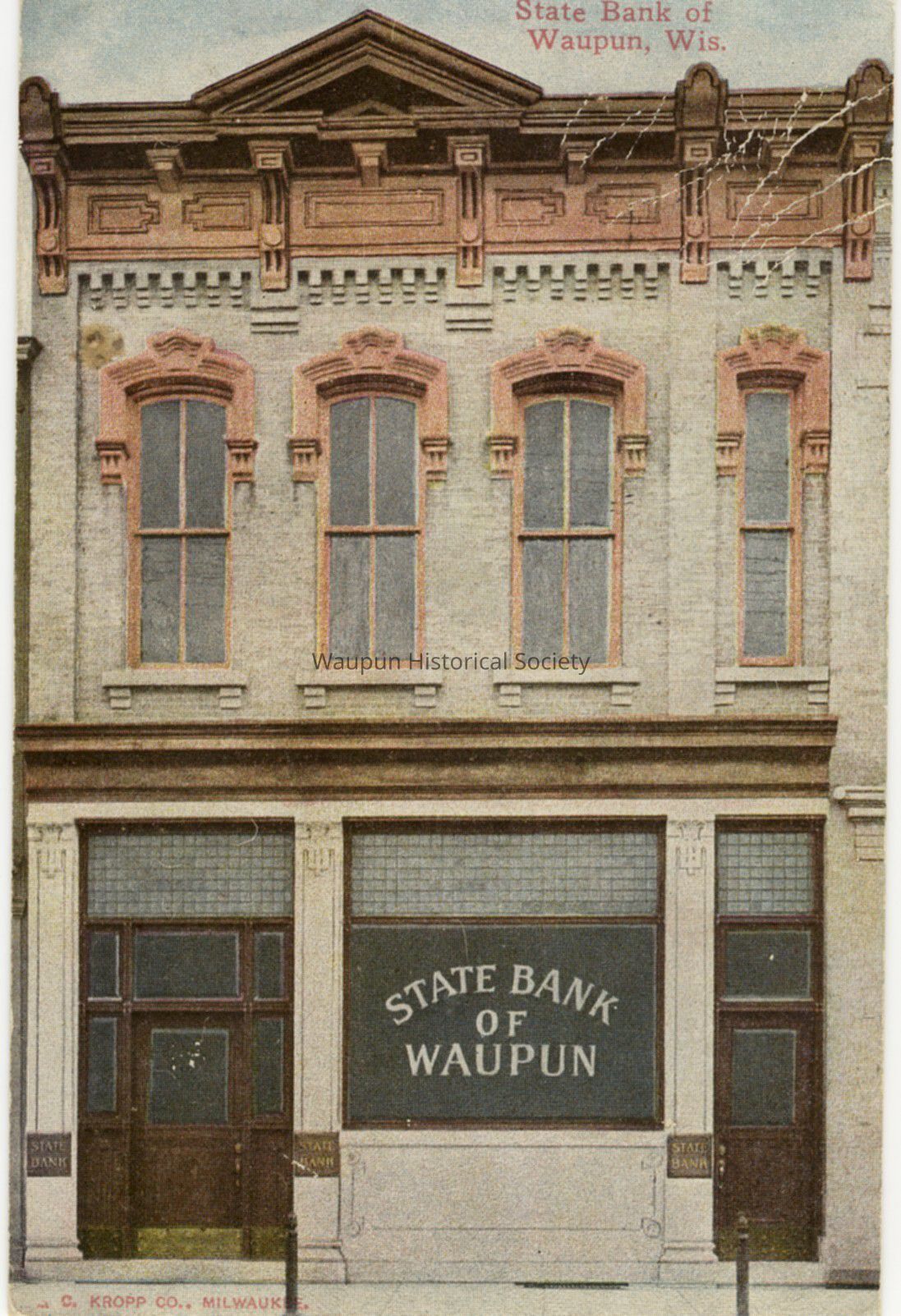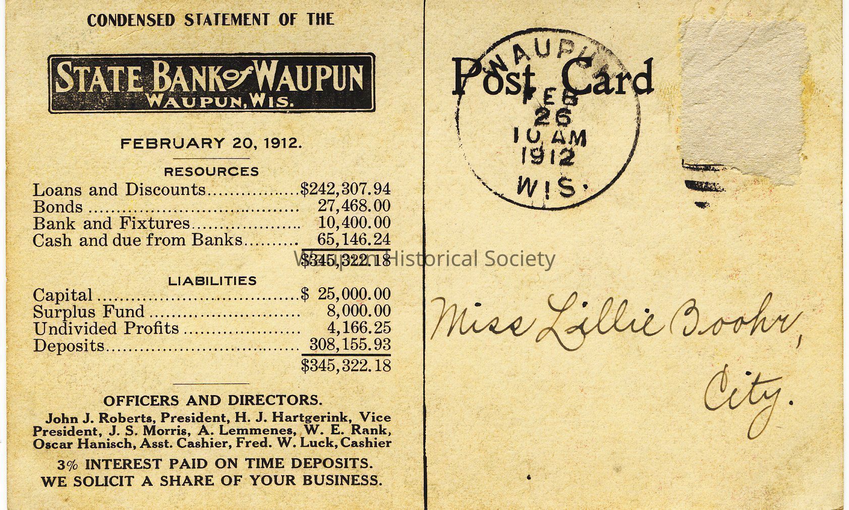 Colorized photo postcard of the Waupun state Bank. On reverse side is printed a "condensed statement of the State Bank of Waupun, Waupun Wisconsin as of Feb. 20, 1912Acquisition