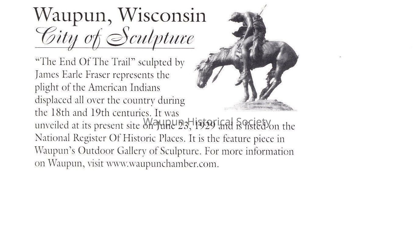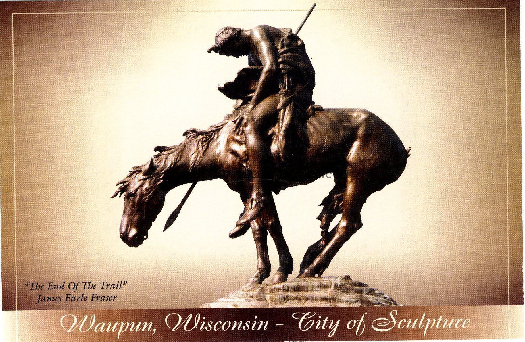 "The End of the Trail" James Earle Fraser represents the plight of the American Indians displaced all over the country during the 18th and 19th centuries. It was unveiled at its present site on June 23, 1929 and is listed on tje National Register Of Historic Places. It is the feature piece in Waupun's Outdoor Gallery of Sculpture. For more information on Waupun, visit www.waupunchamber.com.Acquisition