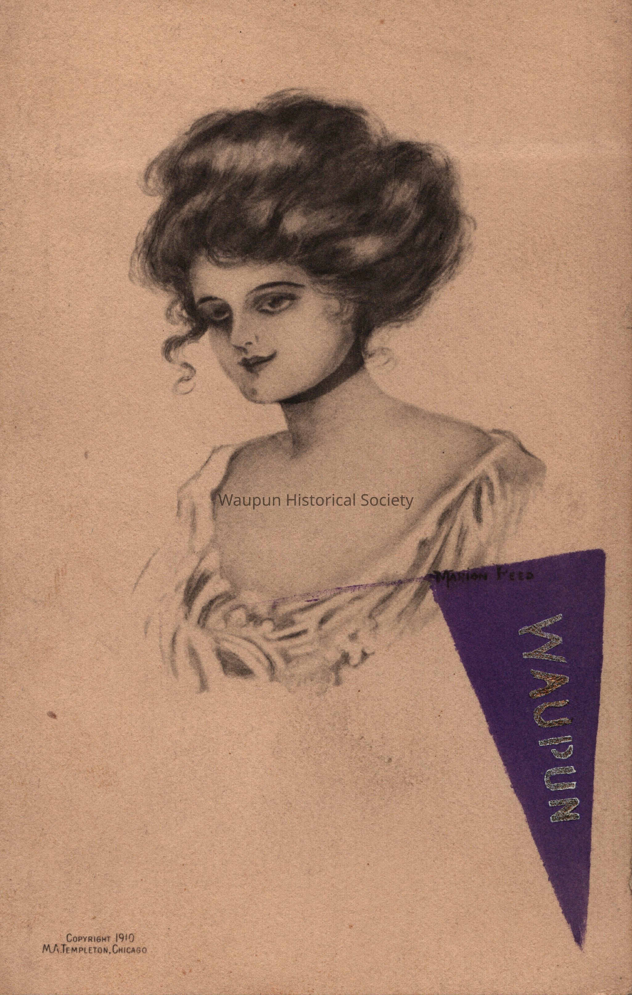 Postcard, Woman, Purple Waupun Pennant