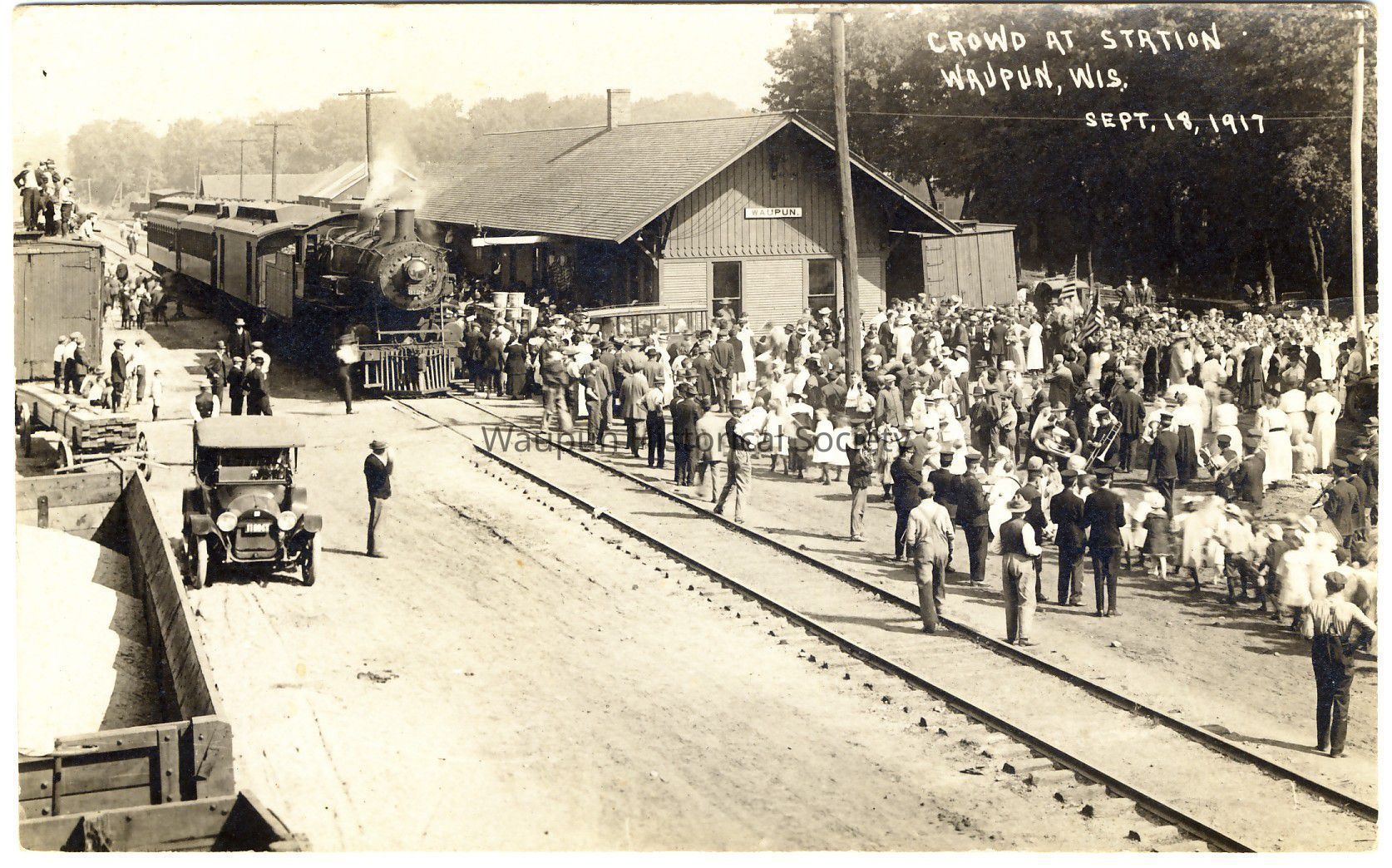Photo post card of crowd at Railroad Station, Waupun, Wis, September 18, 1917. The name Forest Wild is written on it. This was in the box of the collection of Leona Nagler.Acquisition