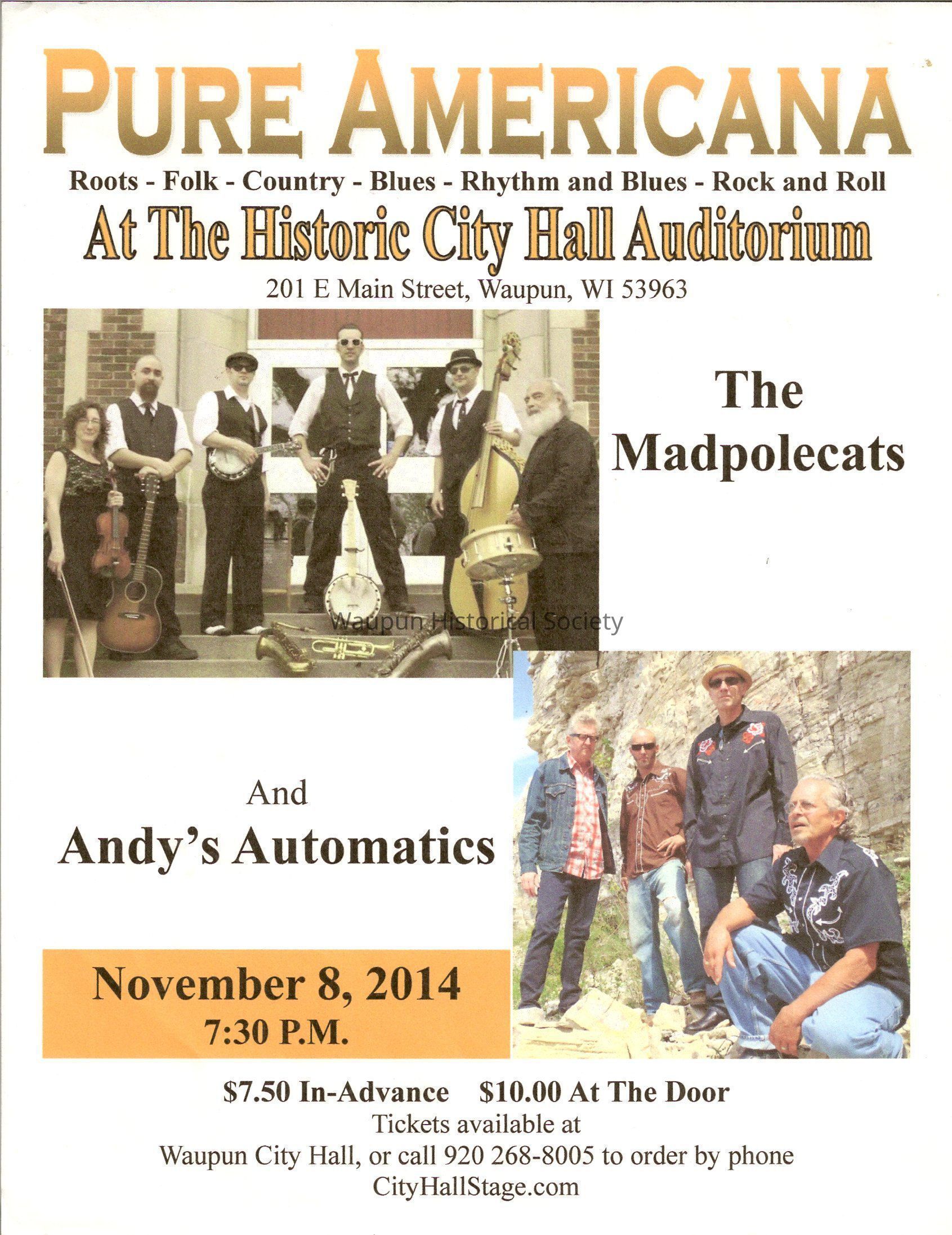A advertisement of Pure Americana a Group Of Bands that playes Roots, Folks, Country, Blues, Rhythm and Blues, and Rock and Roll At The Historic City Hall Auditorium At 201 E, Main Street Waupun Wis, November 8. 2014 such as The Madpolecats, and Andy's Automatics.Acquisition