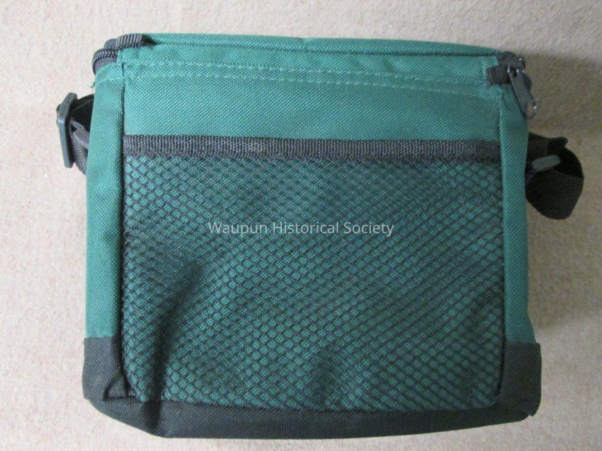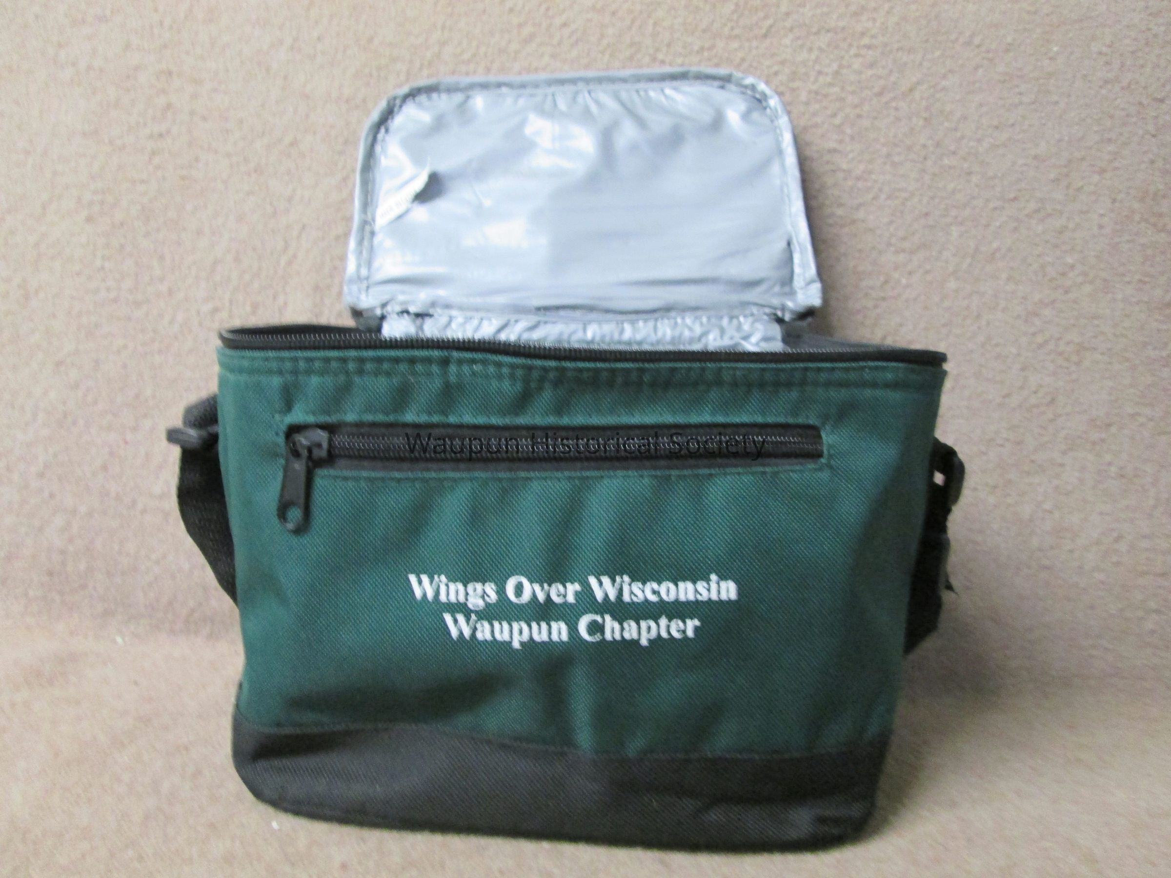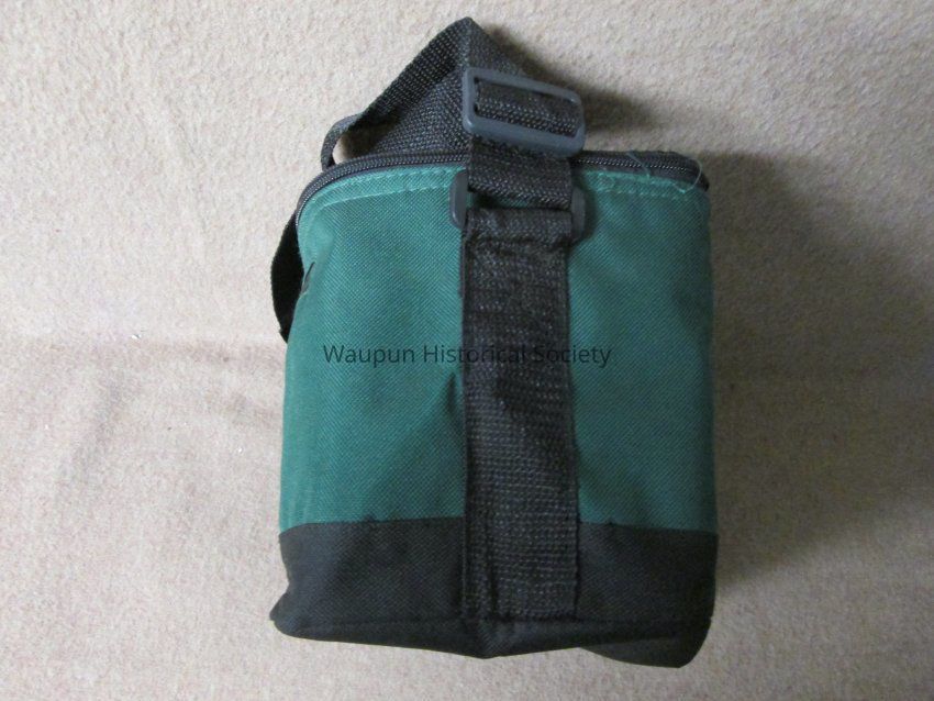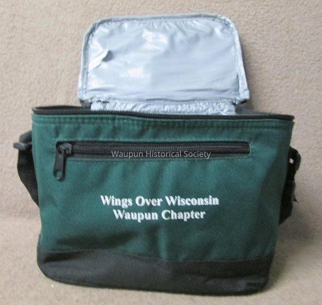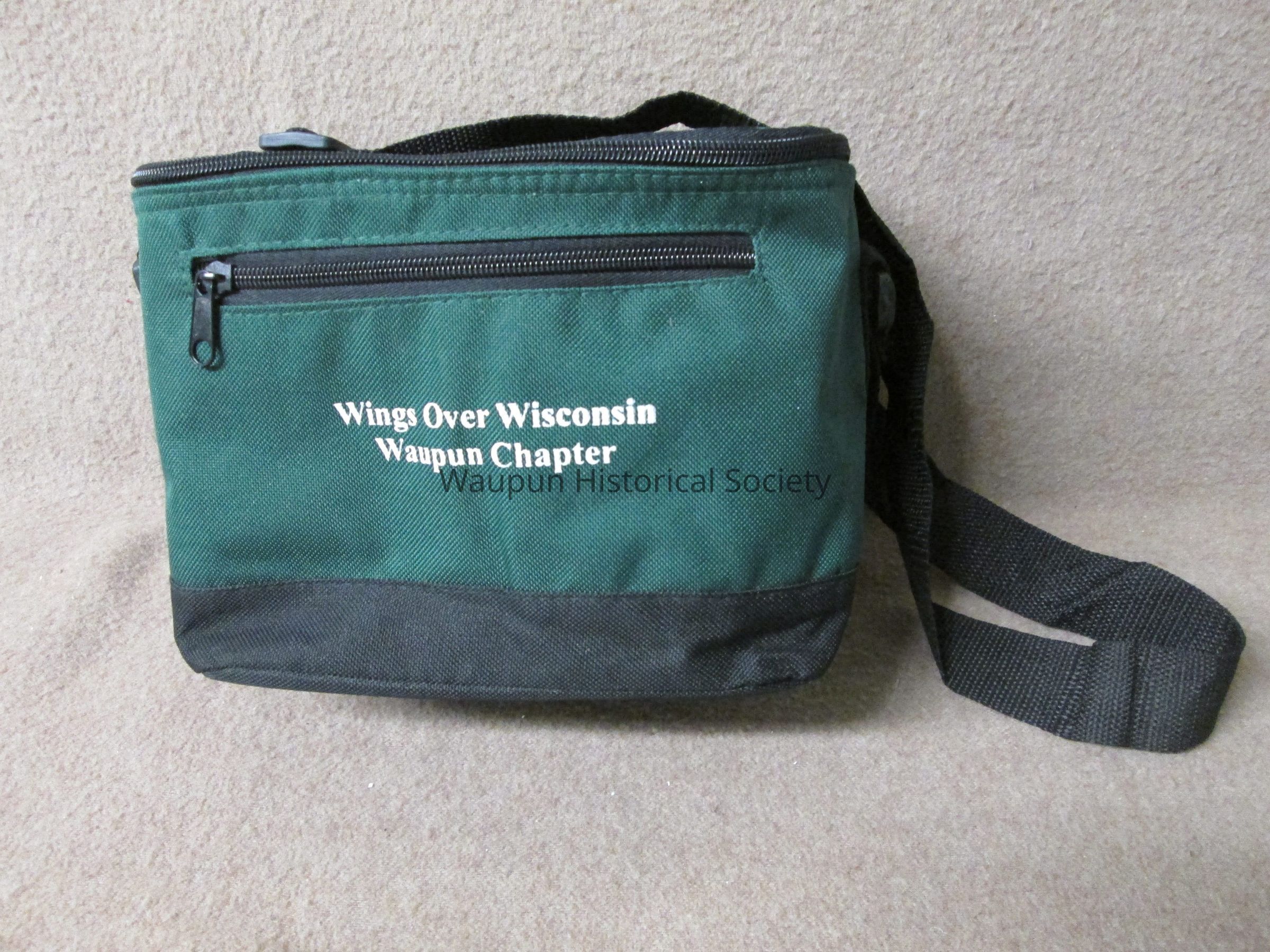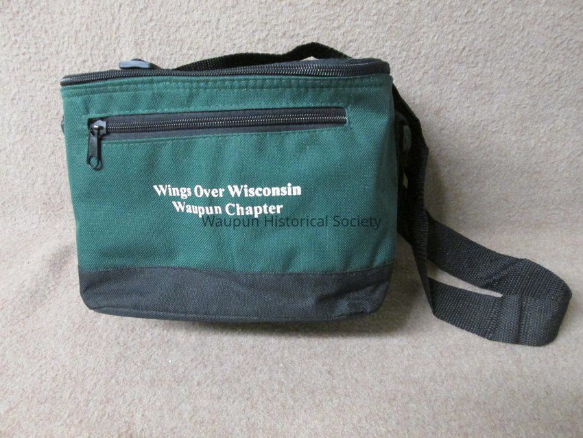 Dark green and black waist pocket, pouch (Lunch bag) with gray vinyl lining, zippered top, black adjustable strap for carrying. A zip pocket on the front and and open mesh pocket on the back. The pouch is the size to accomodate a six pack of cans or could be used for packing a lunch. It is promotional for the Waupun Chapter of "Wings Over Wisconsin" which is printed in white on the front of the pouch.Acquisition
