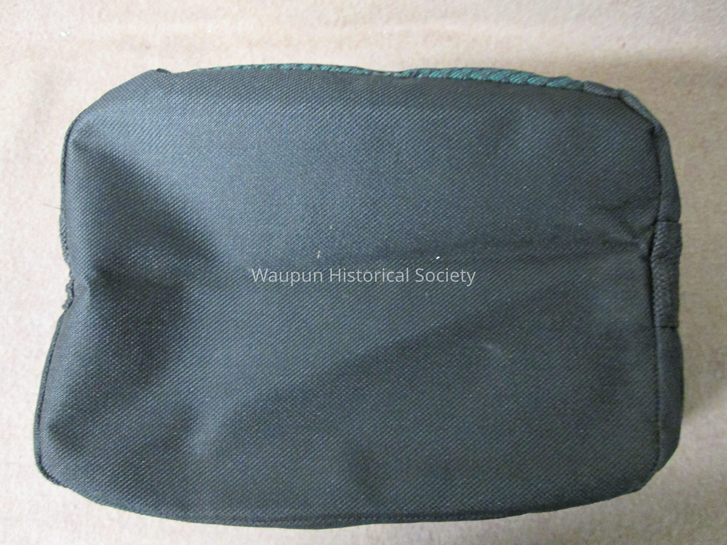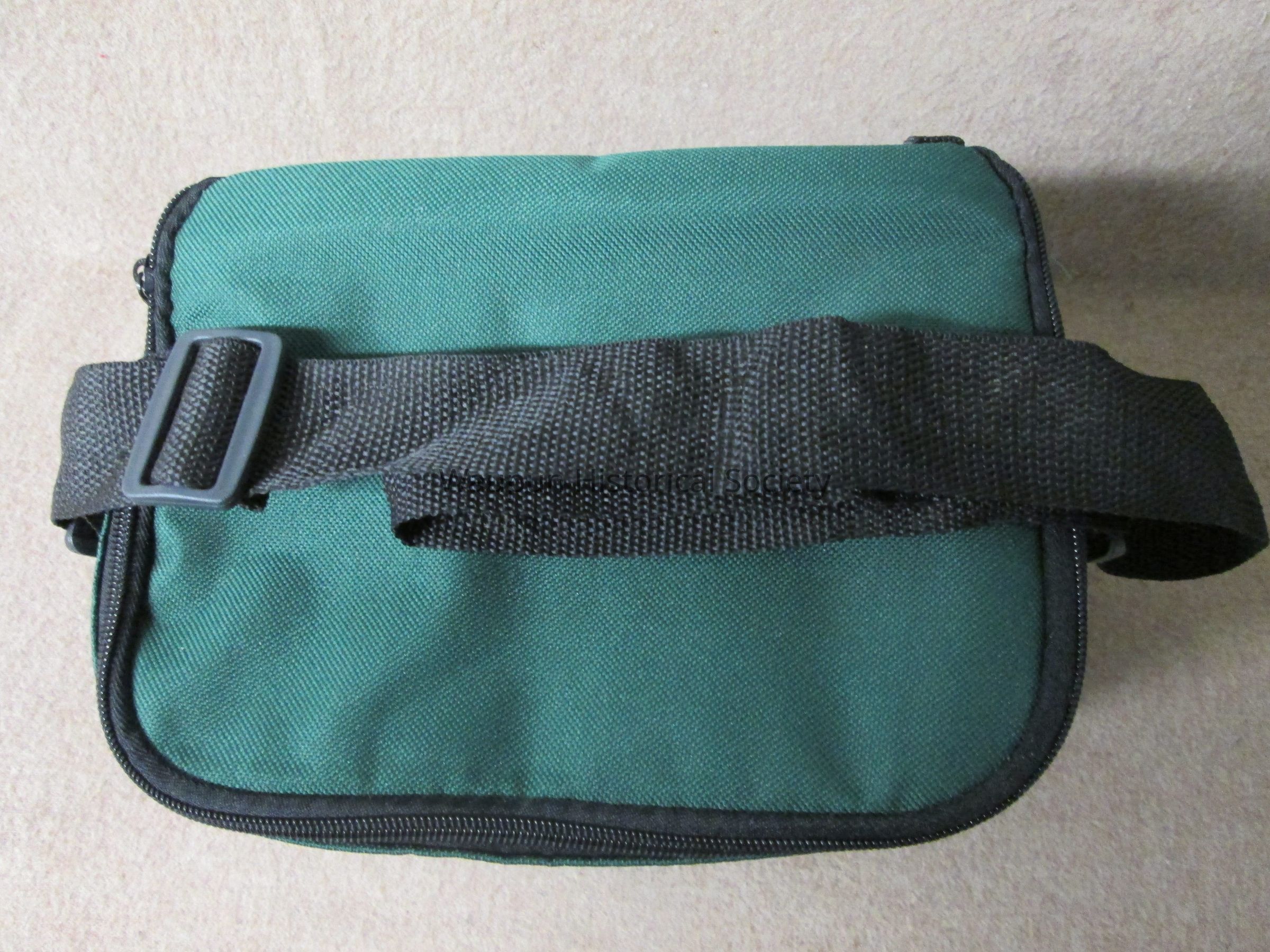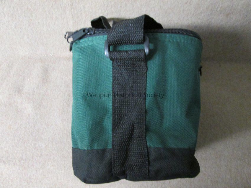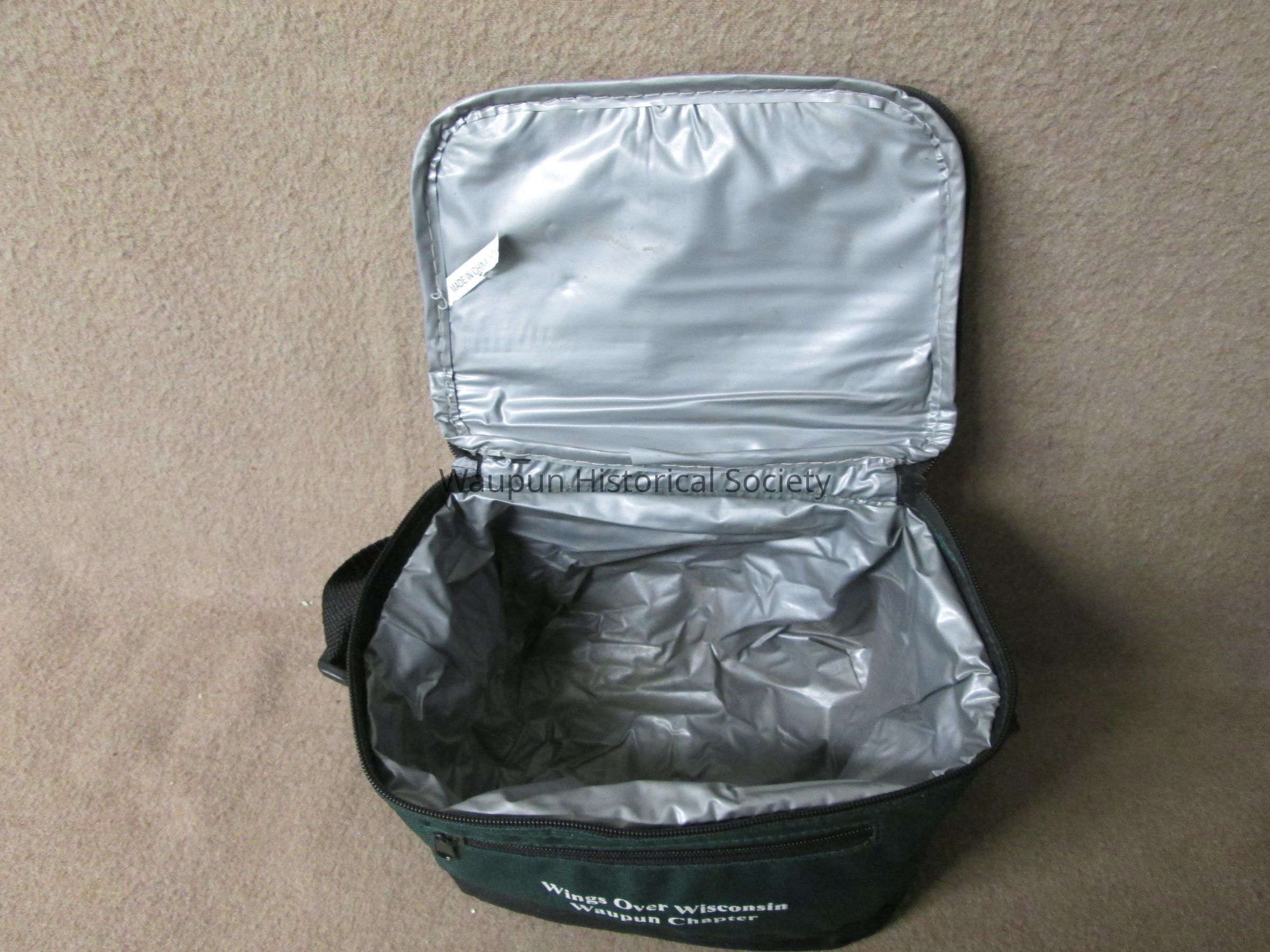 Dark green and black waist pocket, pouch (Lunch bag) with gray vinyl lining, zippered top, black adjustable strap for carrying. A zip pocket on the front and and open mesh pocket on the back. The pouch is the size to accomodate a six pack of cans or could be used for packing a lunch. It is promotional for the Waupun Chapter of "Wings Over Wisconsin" which is printed in white on the front of the pouch.Acquisition