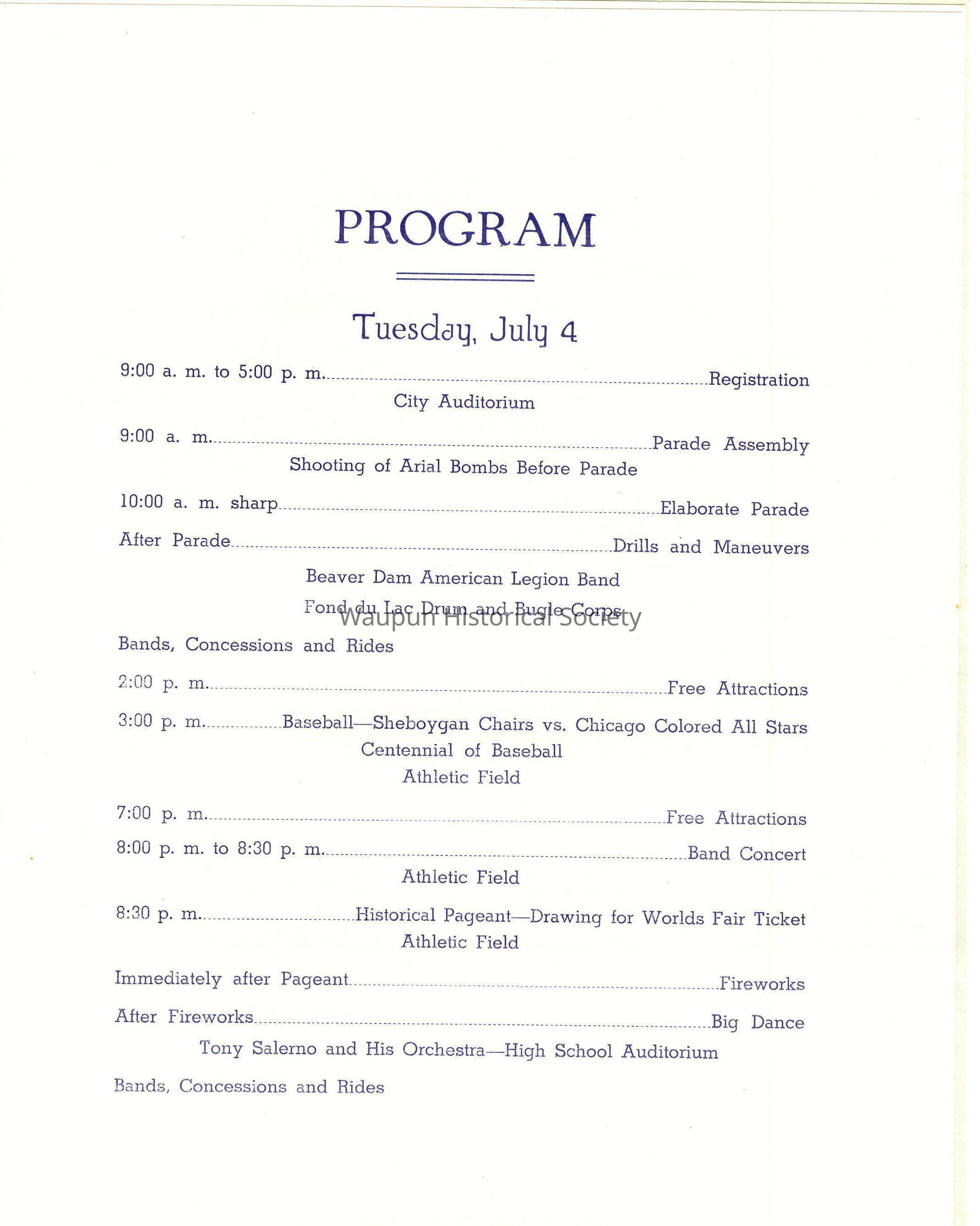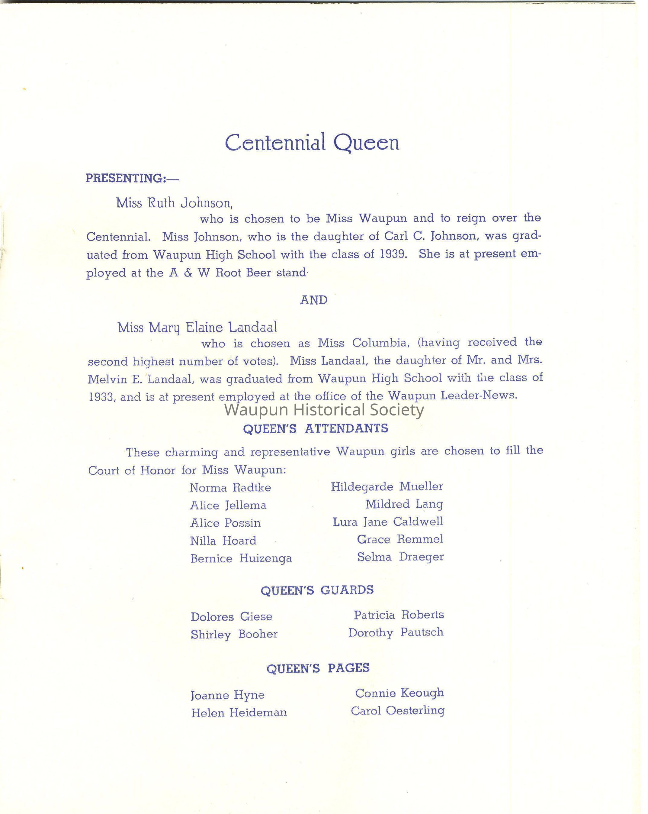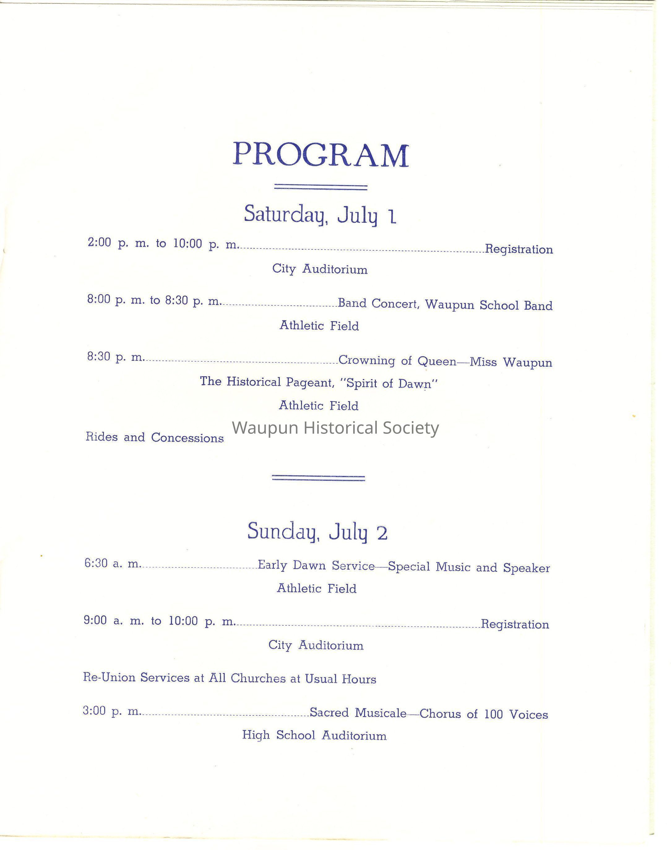 It is a pleasure to greet you. We hope that your visit to us at the time of this Centennial Celebration, whether it be your first, or one of many, will be one whose pleasures you will long remember. Waupun has worked day and night to make this Celebration of her 100th Anniversary a success, and we hope that our efforts meet with your approval. "Make yoursevles at home"- and come to see us again - and often.