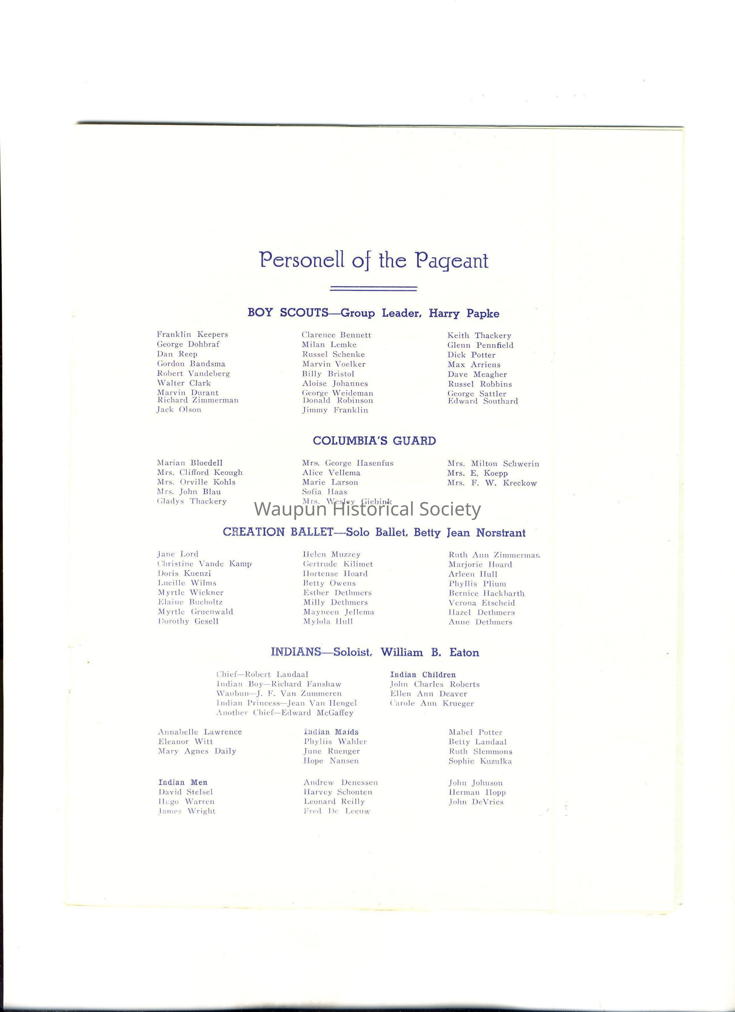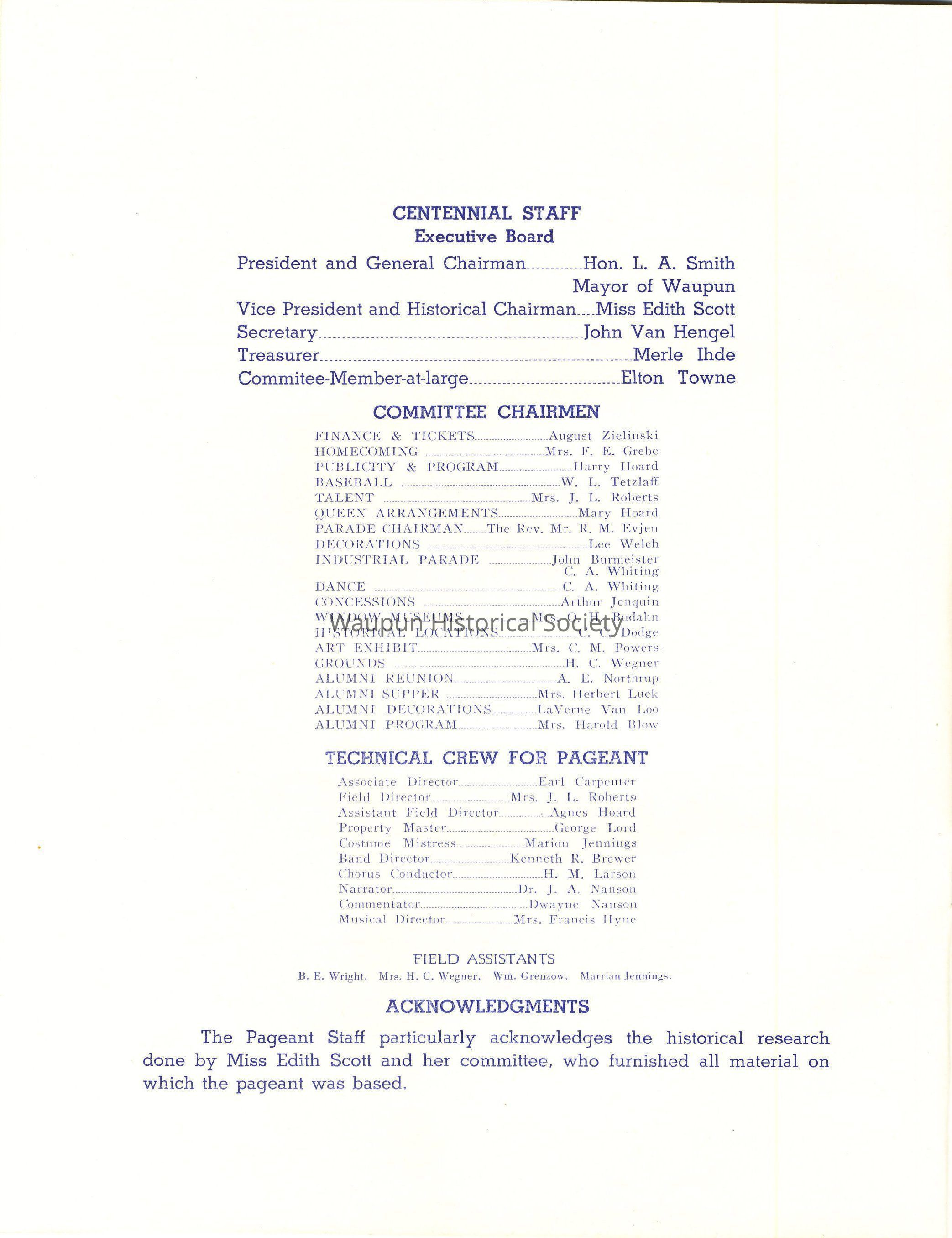 The pages to follow have the names of all the people responsible for working on the centennial staff, Miss Edith Scott and her committee for the pageant material, the Program for each day, personell of the pageant, etc.