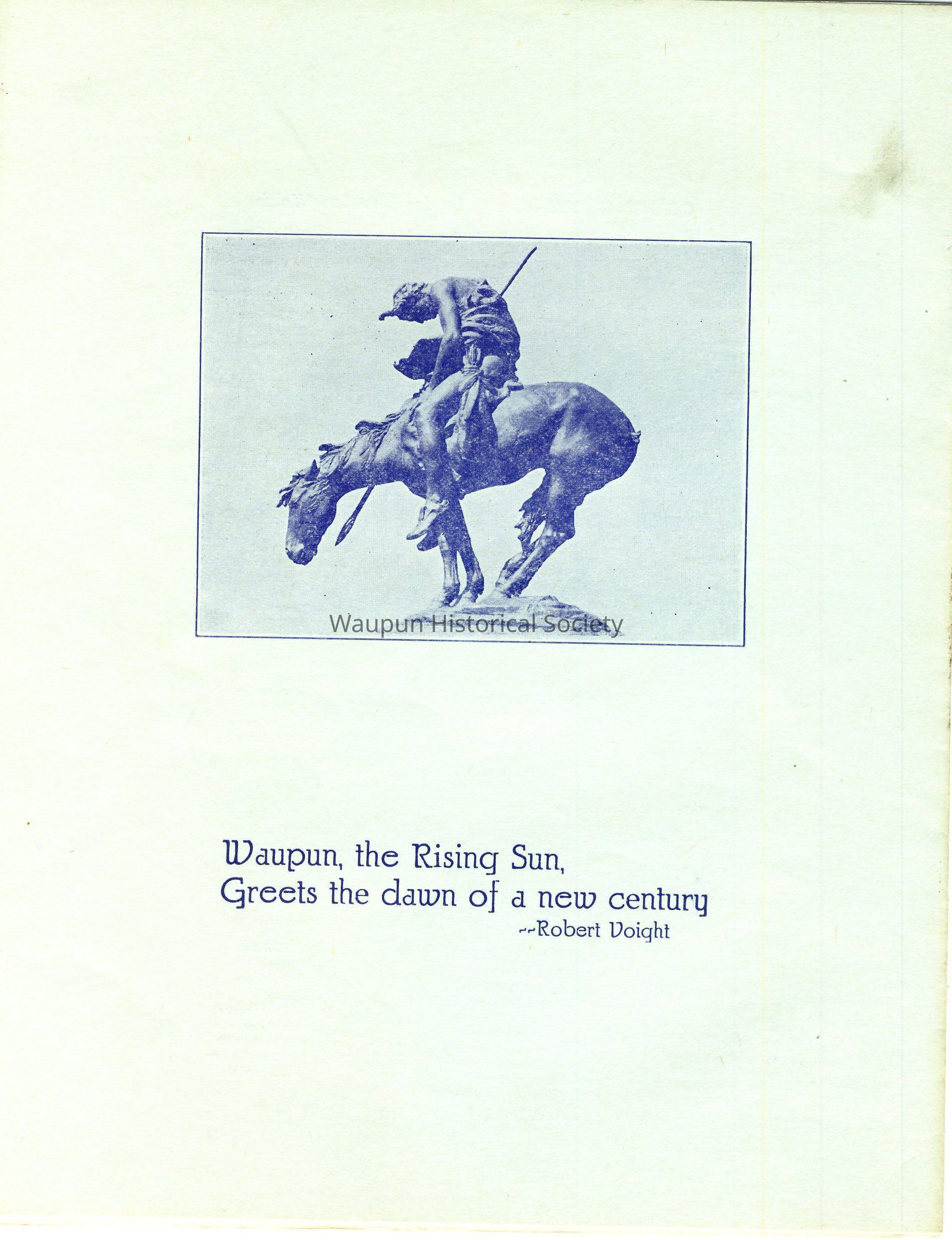The back page has a picture of the "End of the Trail" statue and this saying - Waupun, the Rising Sun, Greets the dawn of a new century --- Robert VoightAcquisition