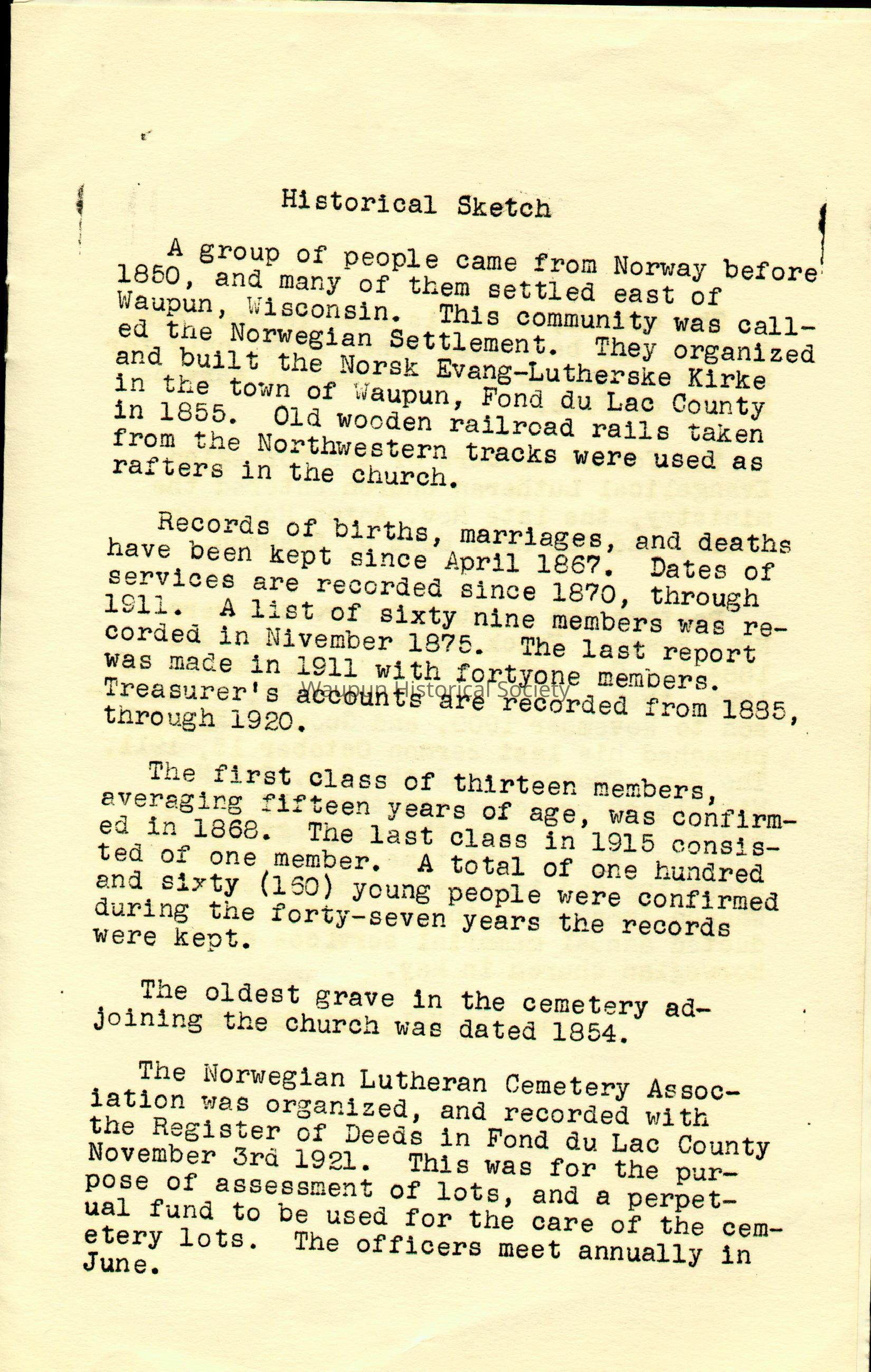 This is a multi page program for "THE 100TH ANNIVERSARY OF THE NORWEGIAN LUTHERAN CHURCH, TOWN OF WAUPUN, WISCONSIN" This event was hel on June 19, 1955. The history of the church is outlined in the program.Acquisition