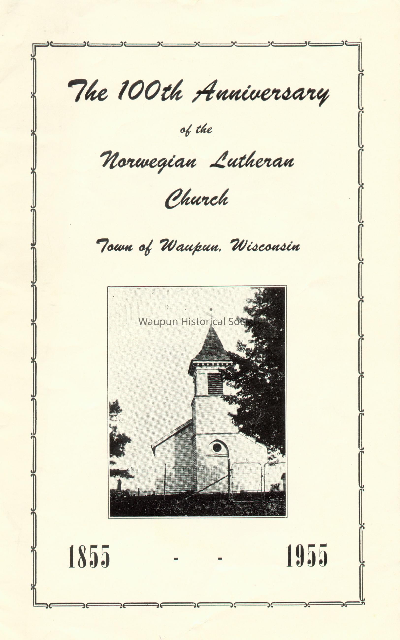 Program, Church, Norwegian, 100th Anniversary of the Norwegian Lutheran Church. This is a multi page program for "THE 100TH ANNIVERSARY OF THE NORWEGIAN LUTHERAN CHURCH, TOWN OF WAUPUN, WISCONSIN" This event was hel on June 19, 1955. The history of the church is outlined in the program.Acquisition