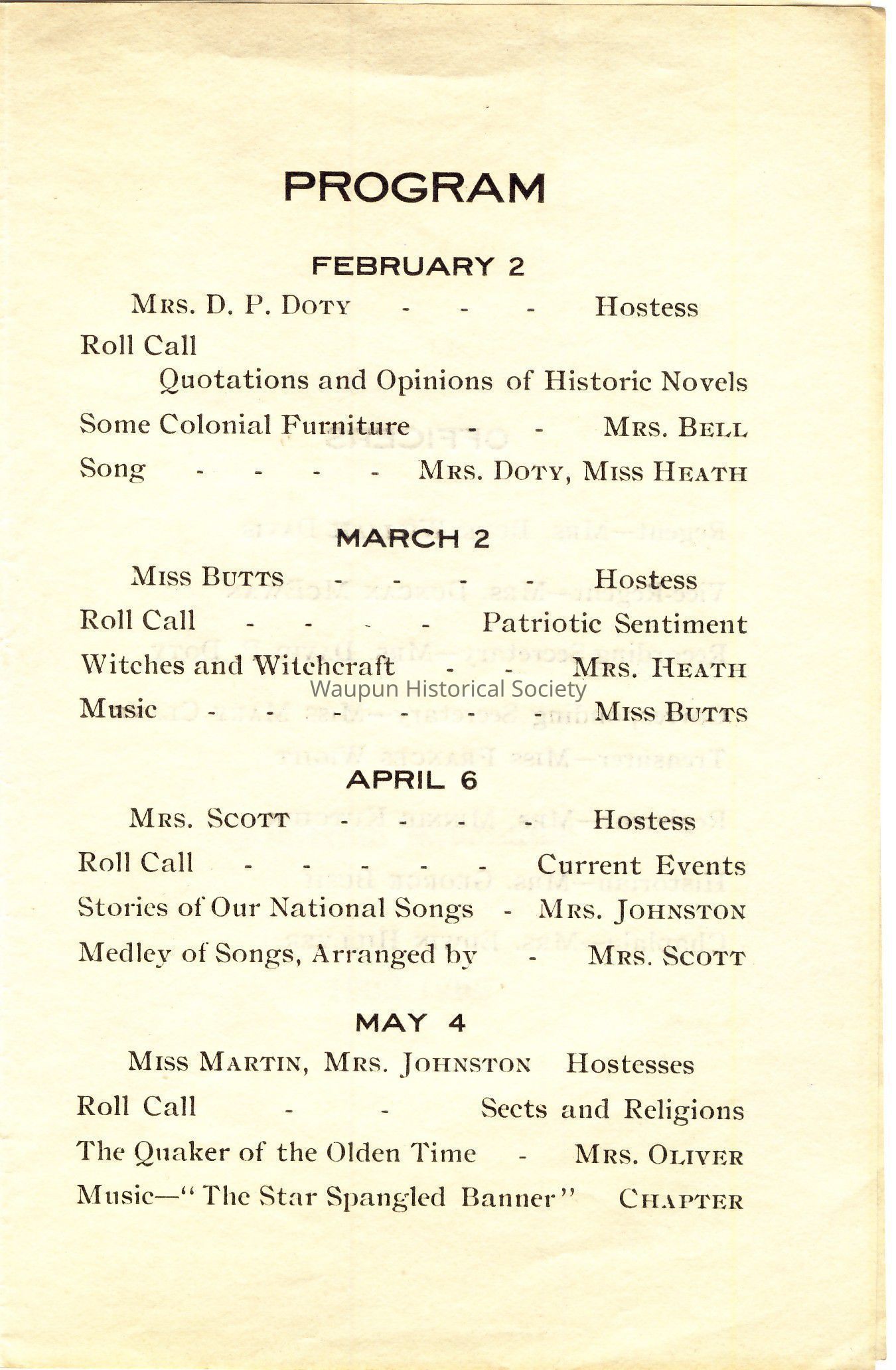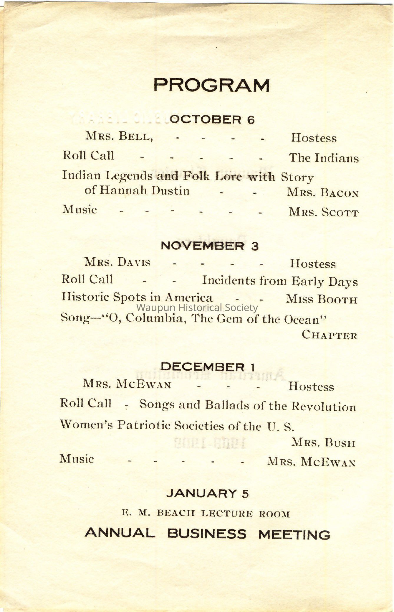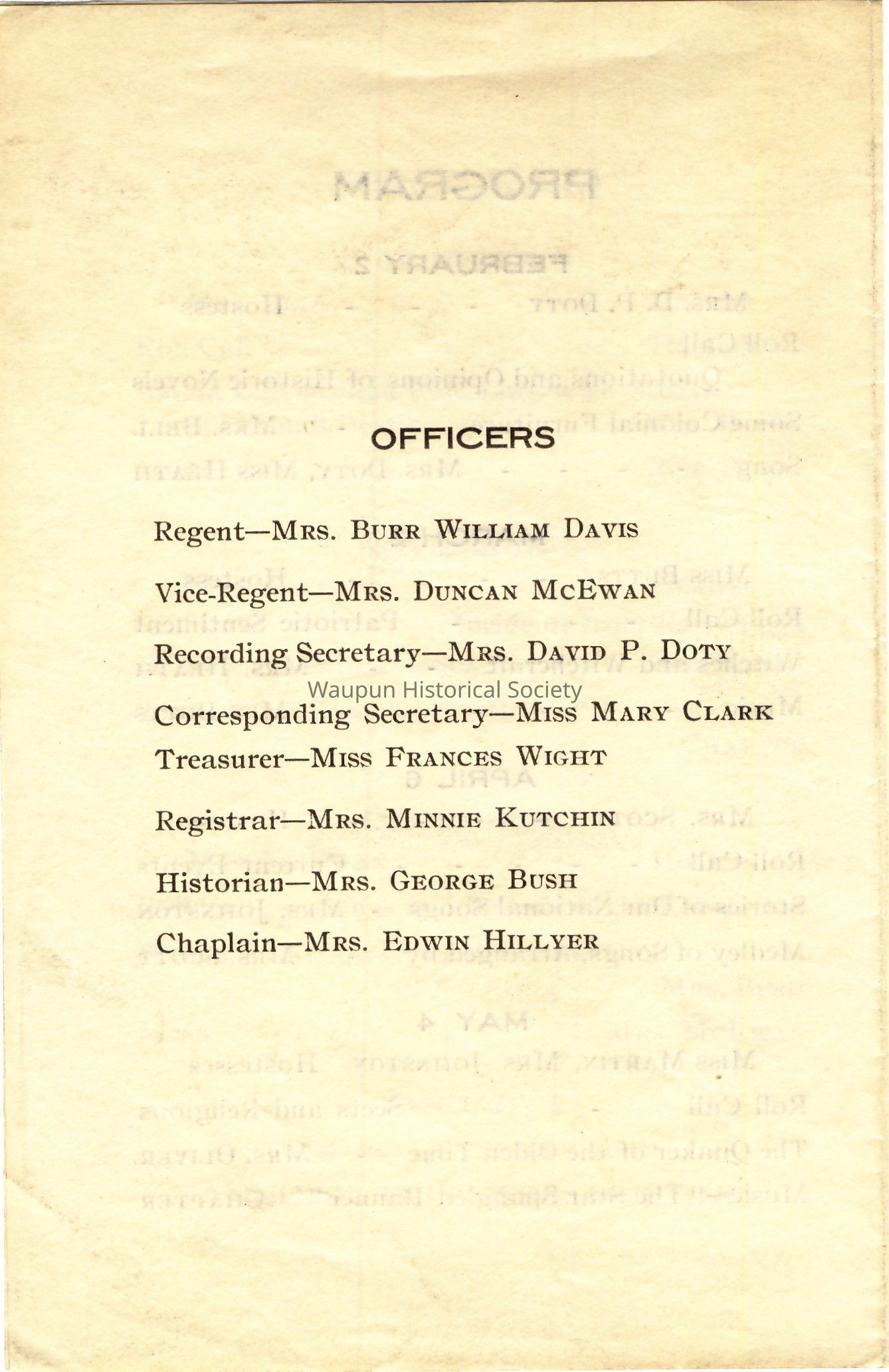 Program from Waupun Chapter of Daughters of the American Revolution dated 1908-1909. Indicates names of officers and other women involved.Acquisition