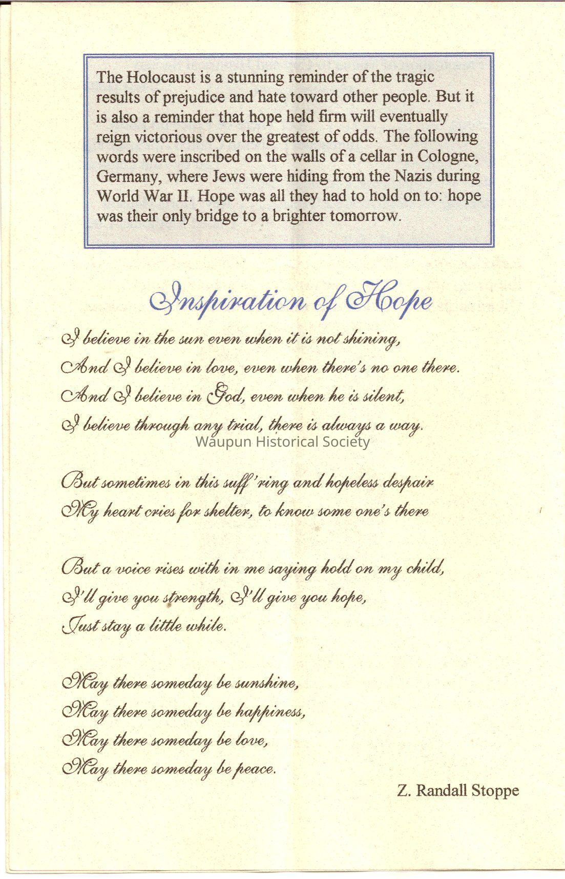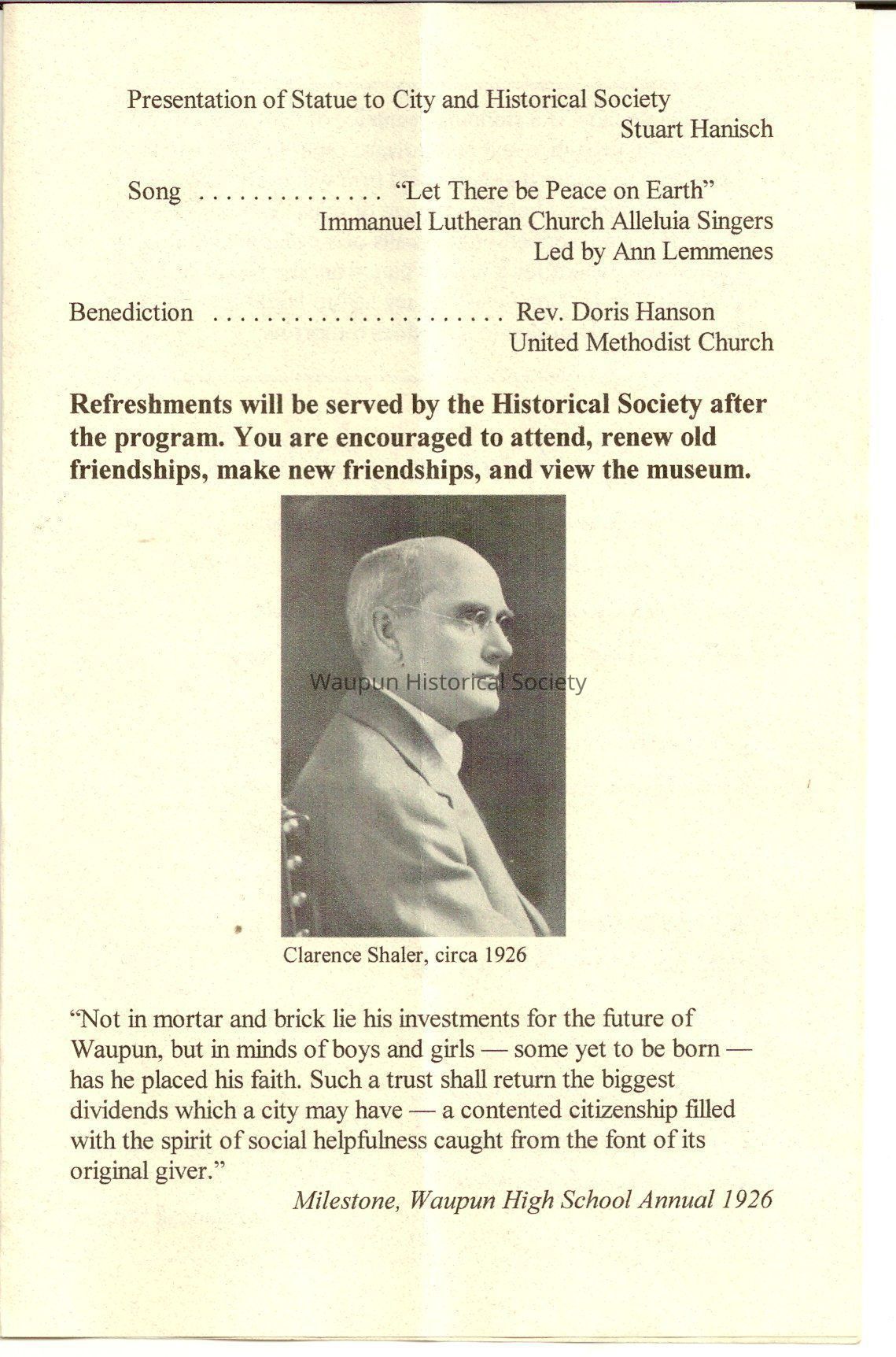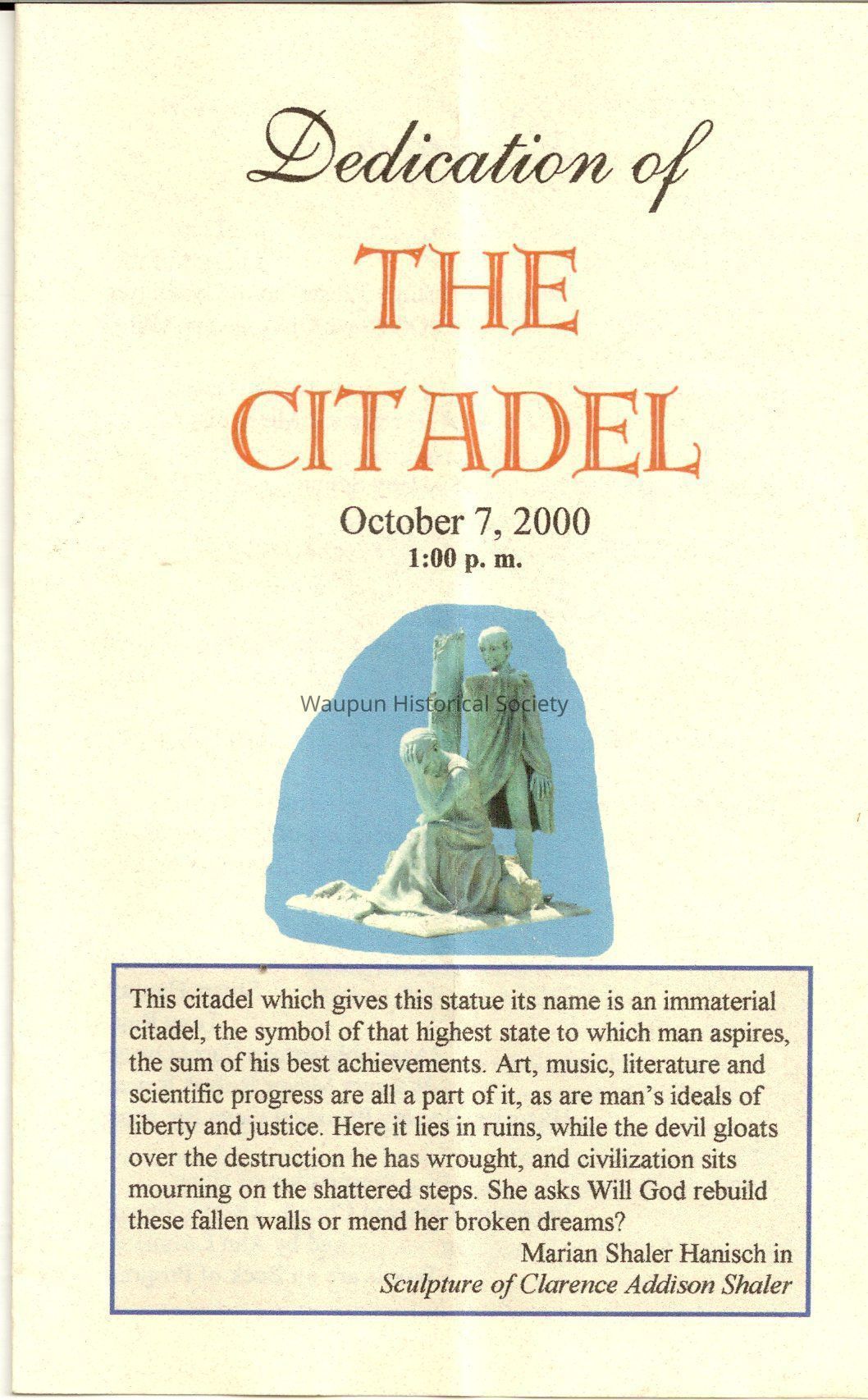 A Pamplets of the Dedication of the Citadel a Statue its name is an immaterial Citadel the symbol of the highest state to which man aspires the sum of his best achievements of arts, and music and literatureAcquisition