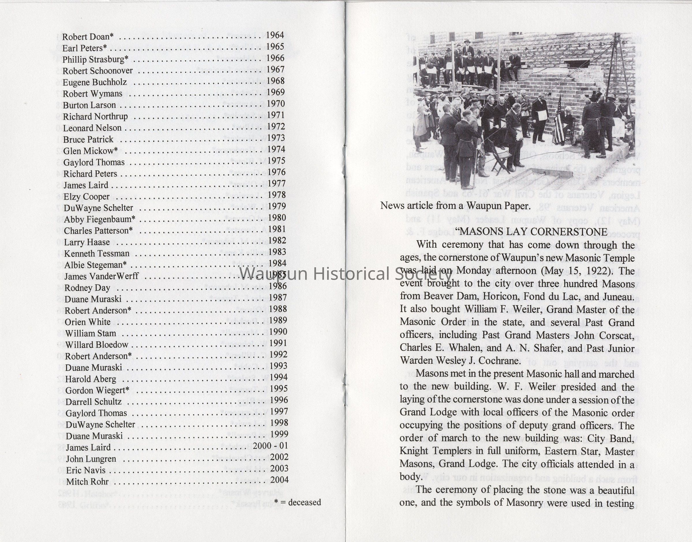 The ceremony of placing the stone was a beautiful one, and the symbols of Masonry were used in testing the stone, the corn of nourishment, the wine of refreshment and the oil of joy were used as symbols of what the building should mean to Masons and the community. In the strong box were placed the following articles: lists of Officers and members of the Waupun Lodge No. 48 F. & A. M., Officers and Companions of Waupun Chapter of No. 48 R.A.M., original donators to the Masonic site, Officers and members of Waupun Chapter No. 144 O.E.S., Officers and teachers of the Waupun Public Schools, Officers of the City of Waupun, program for the laying of the cornerstone, Officers and members of Dan E. Getchel Post No. 210 American Legion, Veterans of the Civil War '61-'65 and Spanish American Veterans '98, copy of Waupun Democrat (May 12), copy of Waupun Leader (May 11) and proceedings of the Most Worshipful Grand Lodge F. & A. M. State of Wisconsin.