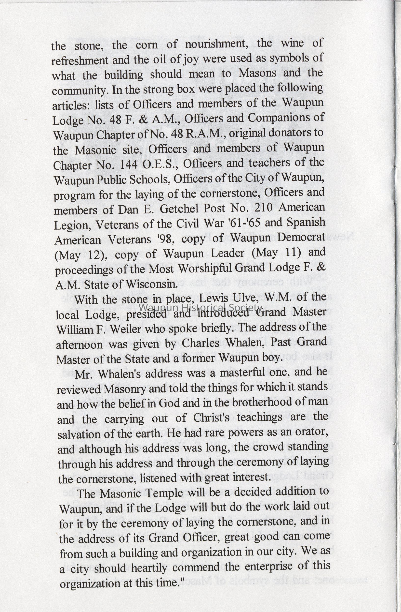 With the stone in place, Lewis Ulve, W. M. of the local Lodge, presided and introduced Grand Master William F. Weiler who spoke briefly. The address of the afternoon was given by Charles Whalen, Past Grand Master of the State and a former Waupun boy.