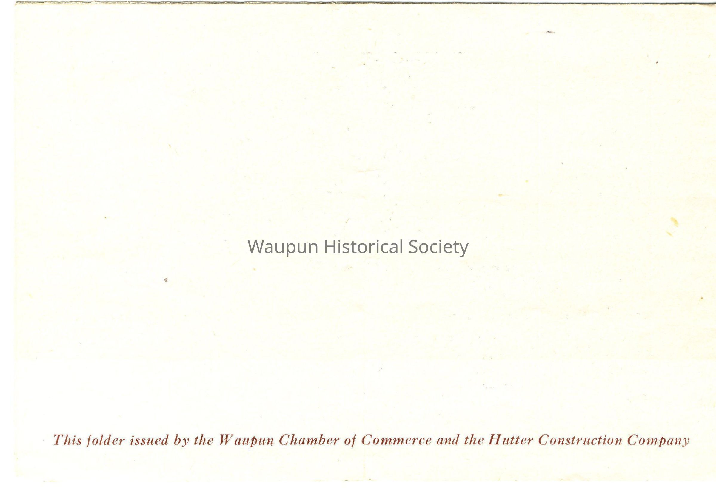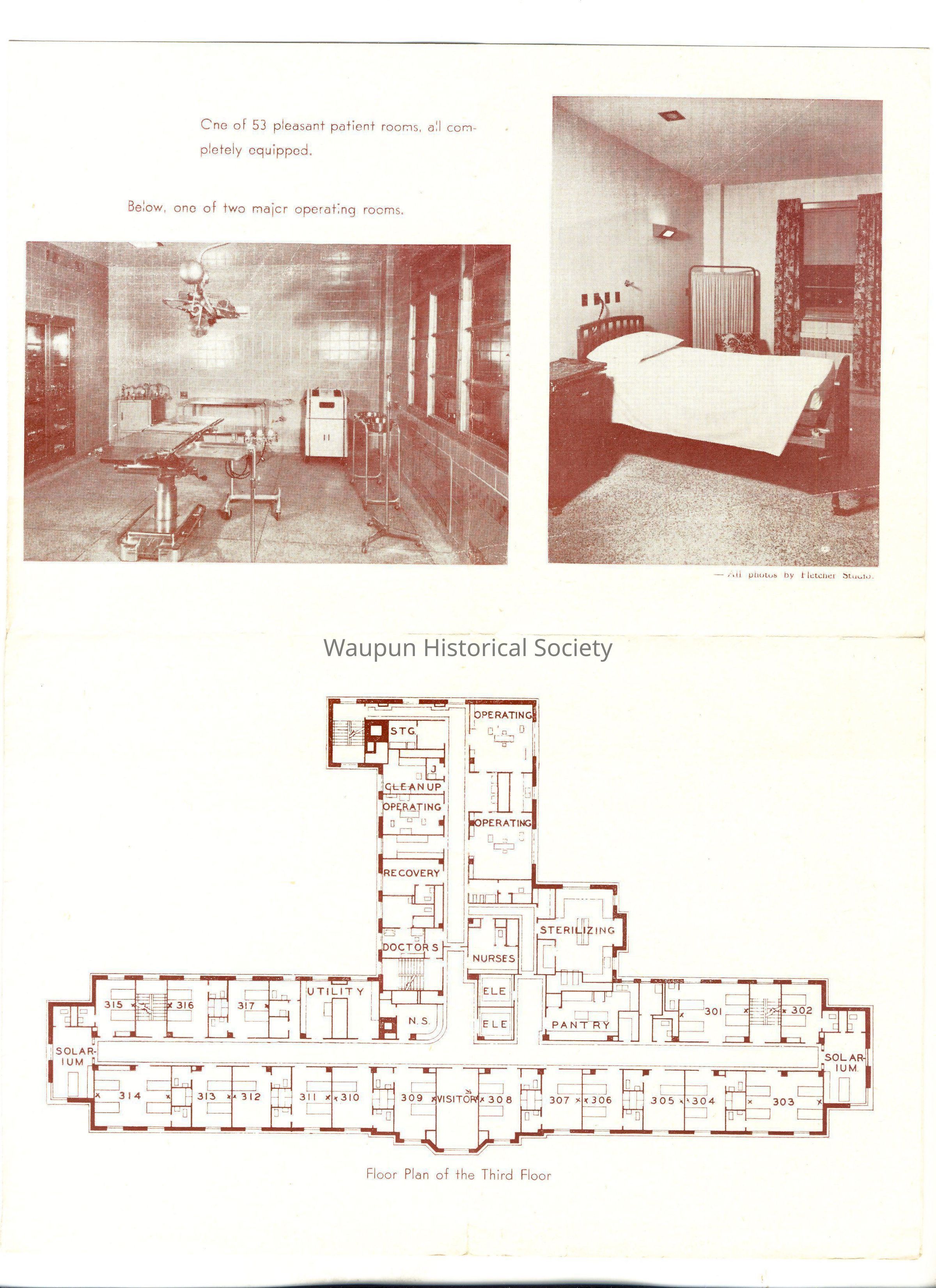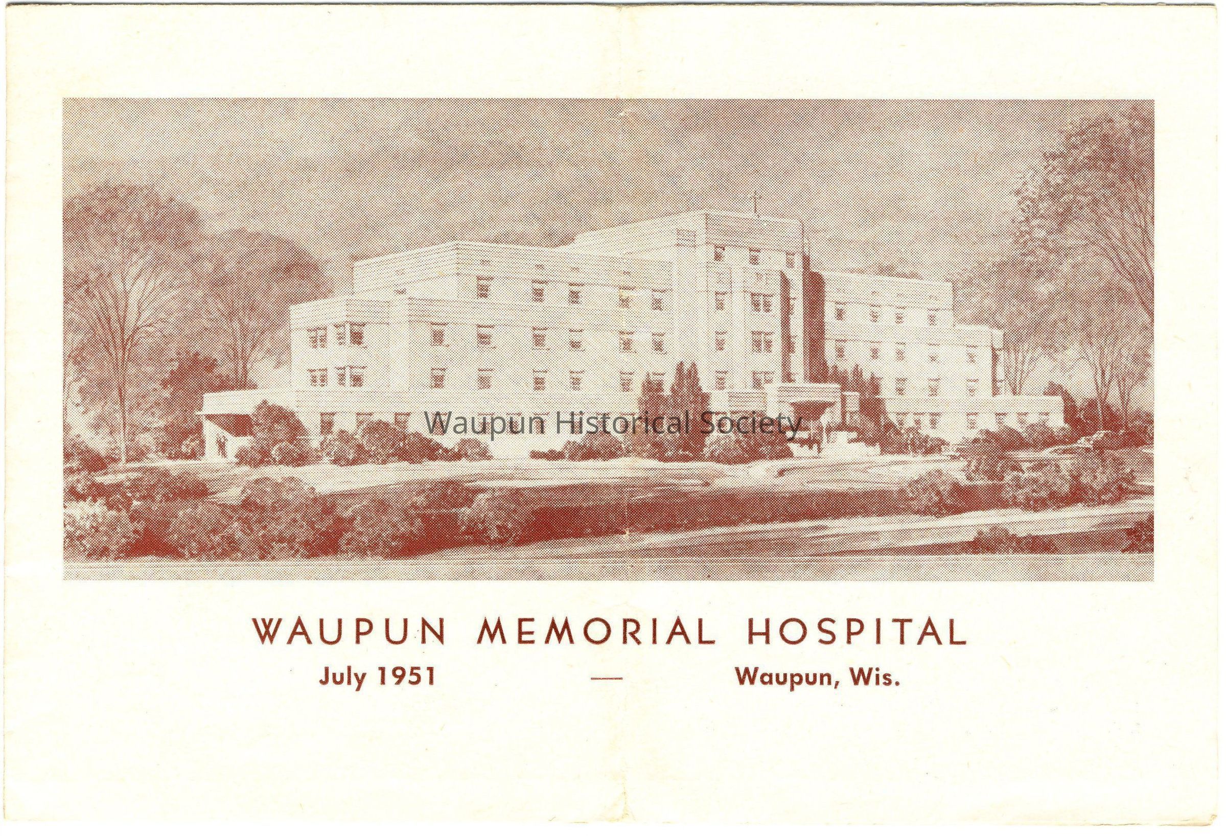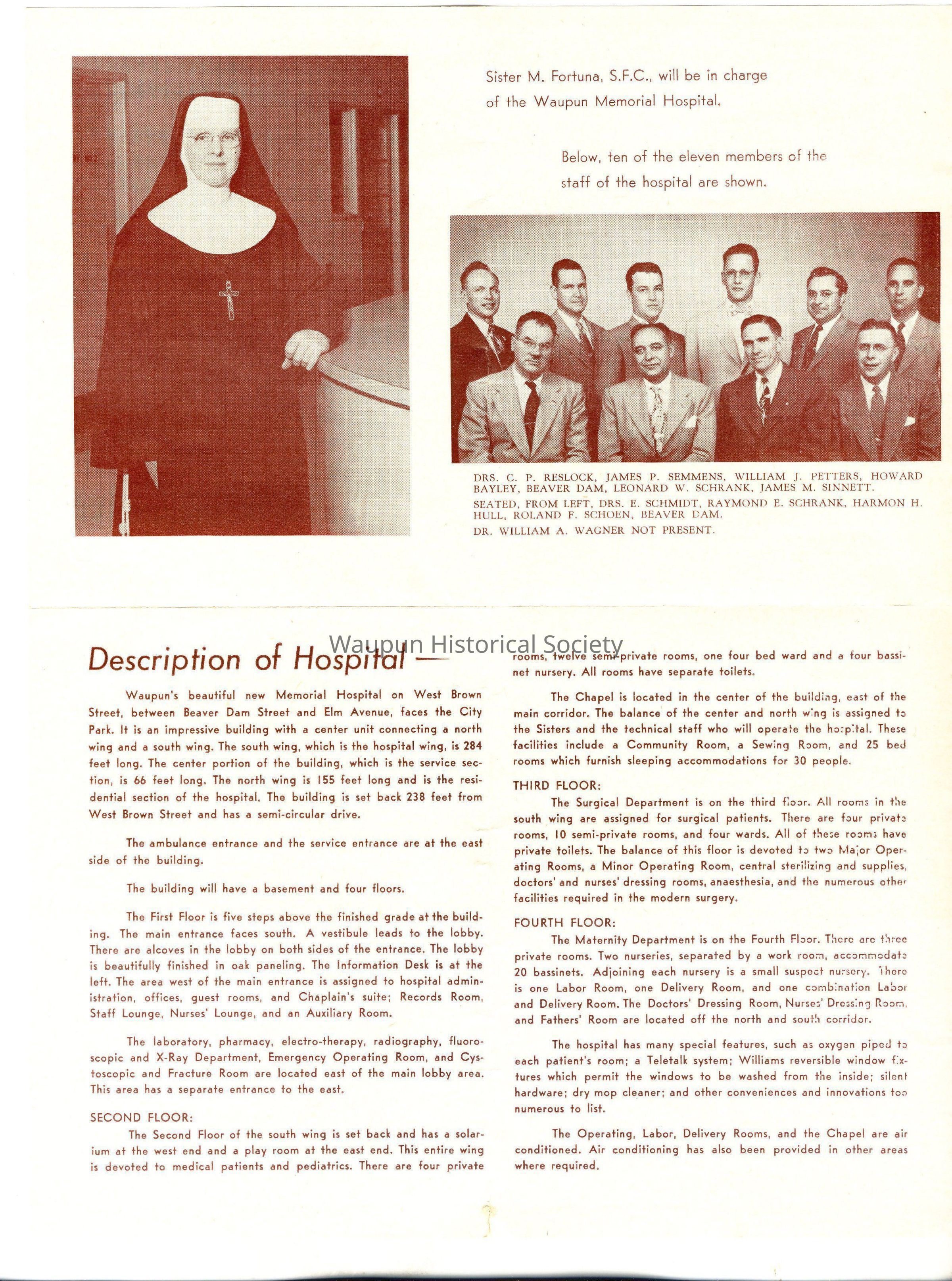 Pamplet issued by the Waupun Chamber of Commerce and the Hutter Construction Company for the July 1951 opening of the Waupun Memorial Hosital. Included are photos of the 10 of the eleven members of the staff, Sister M. Fortuna, S.F.C., who was in charge of the hospital, one of the major operating rooms, one of the 53 patient rooms and a floor plan of the third floor. There is a history of the hospital and a description typed on the inside of the pamphlet.