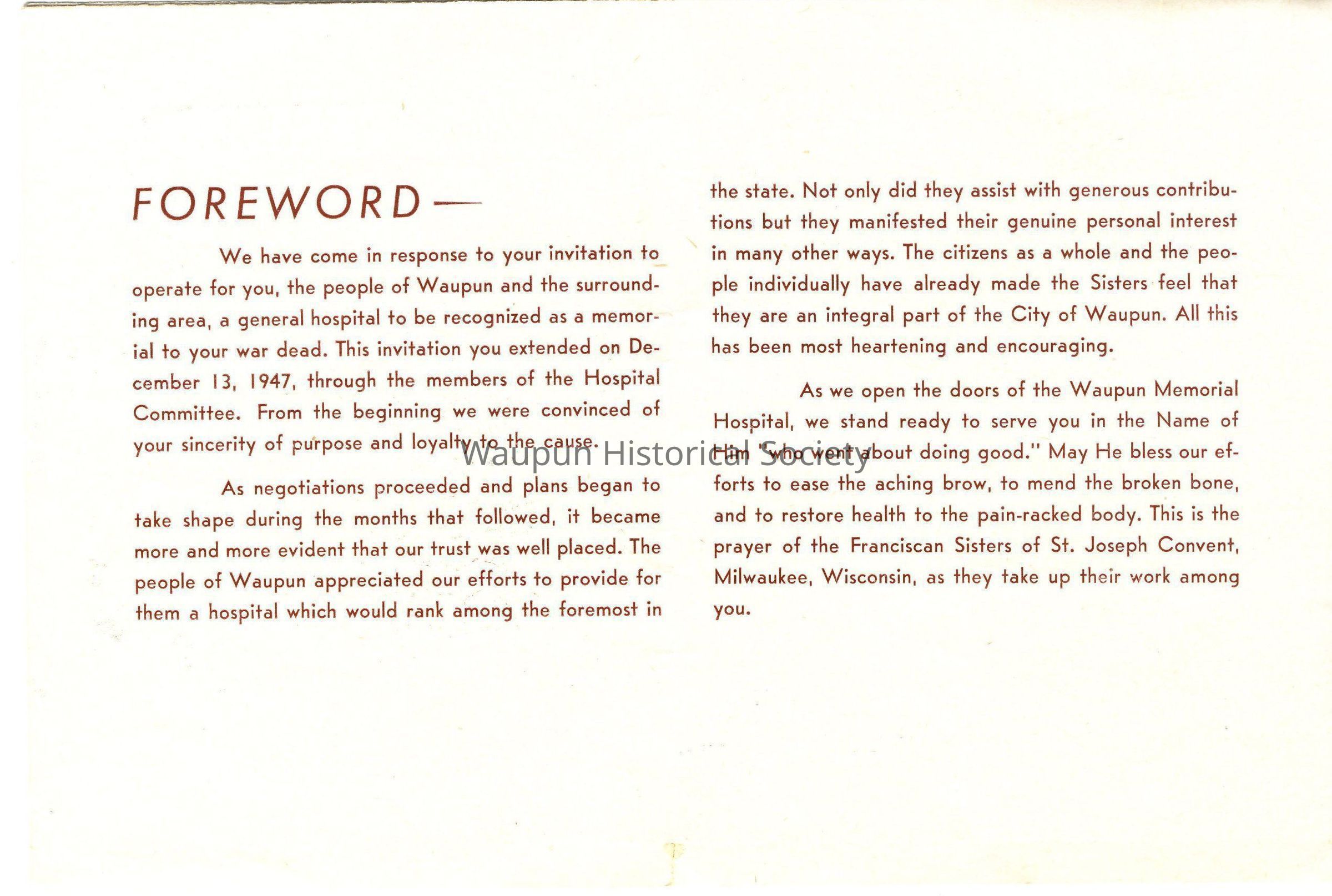 As we open the doors of the Waupun Memorial Hospital, we stand ready to serve you in the Name of Him "who went about doing good." May He belss our efforts to ease the aching brow, to mend the broken bone, and to restore health to the pain-racked body. This is the prayer of the Fransican Sisters of St. Joseph Convent, Milwaukee, Wisconsin, as they take up their work among you.