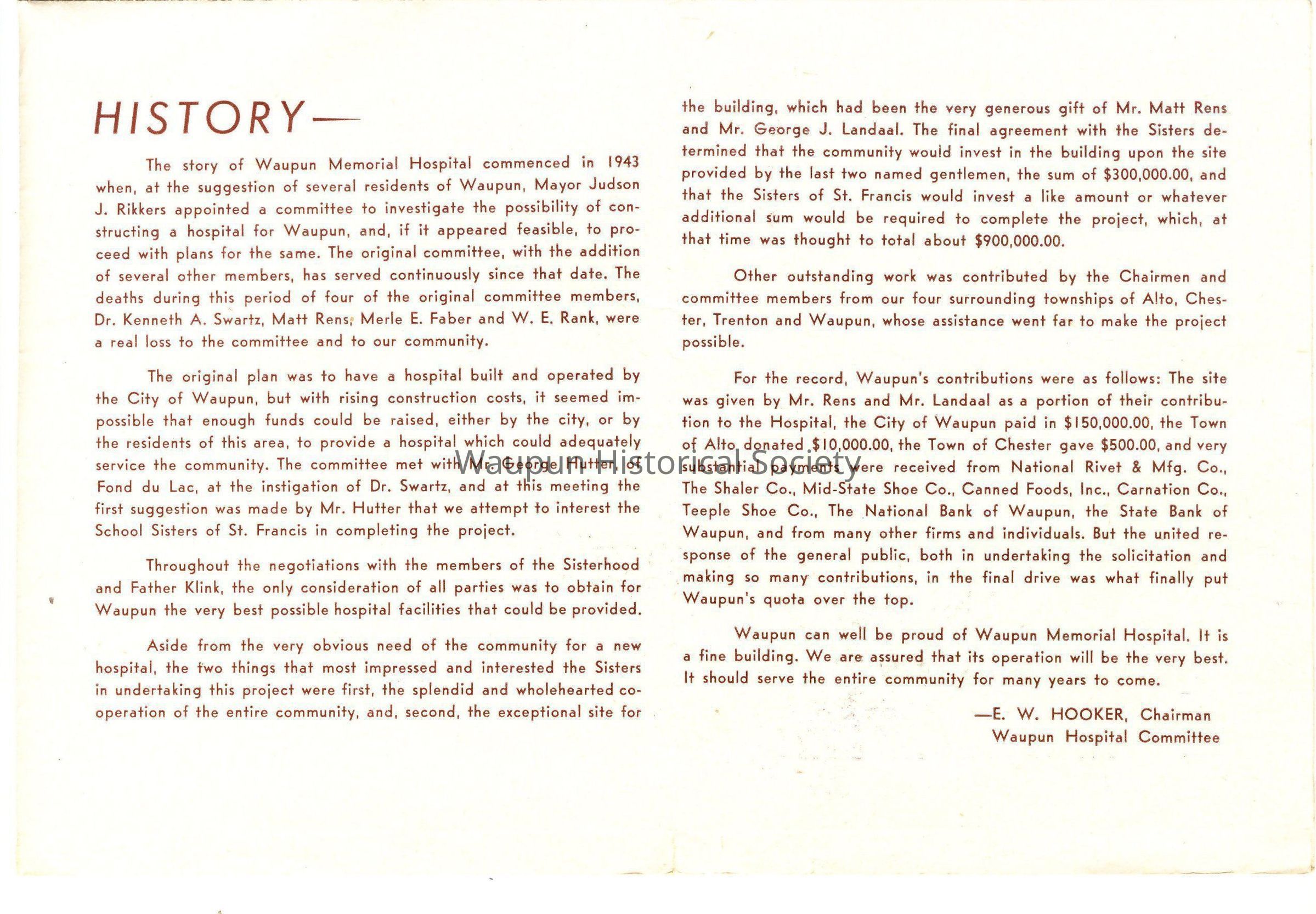 The story of Waupun Memorial Hospital commenced in 1943 when, at the suggestion of several residents of Waupun, Mayor Juson J. Rikkers appointed a committee to investigate the possibility of constructing a hospital for Waupun, and, if it appeared feasible, to proceed with plans for the same. The original committee, with the addition of several other members, has served continuously since that date. The deaths during this period of four of the original committee members, Dr. Kenneth A. Swartz, Matt Rens, Merle E. Faber and W. E. Raml. were a real loss to the committee and to our community.