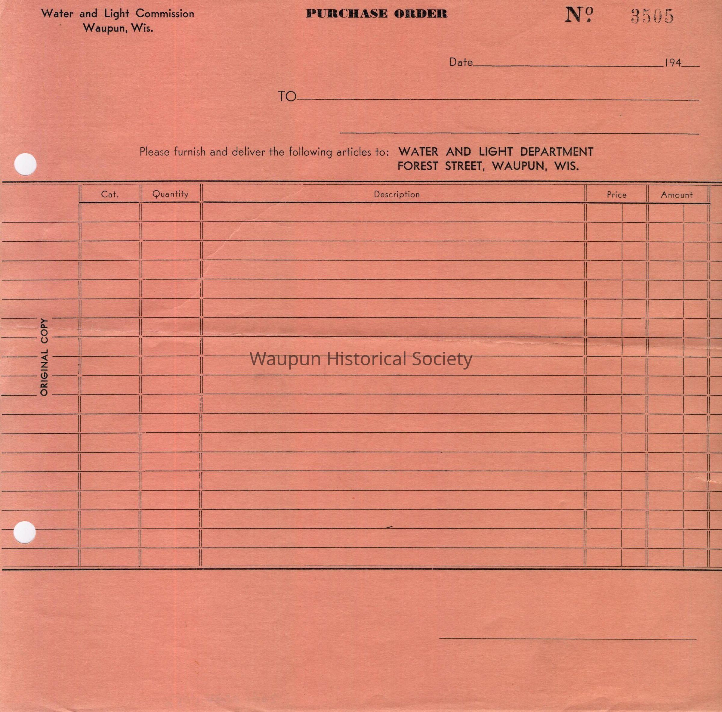 Purchase Order, Utilities, Water and Light Commission. Water and Light Commission Purchase Order, Forest Street, Waupun, Wisconsin.Acquisition