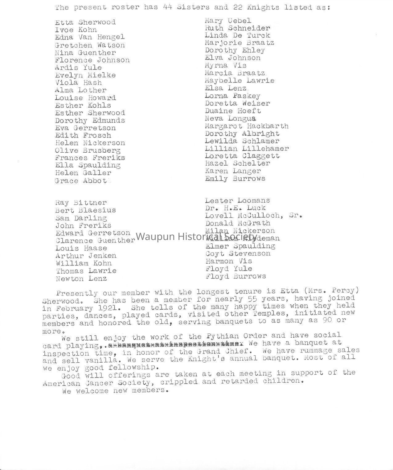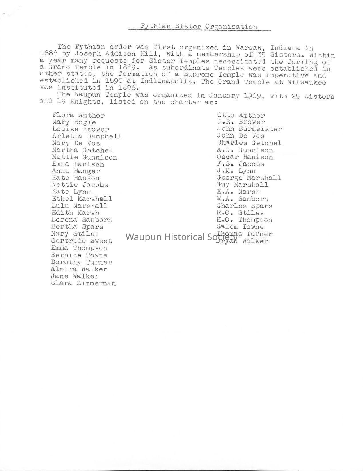 The Waupun Temple was organized in January 1909, with 25 Sisters and 19 Knights, listed on the charter as: