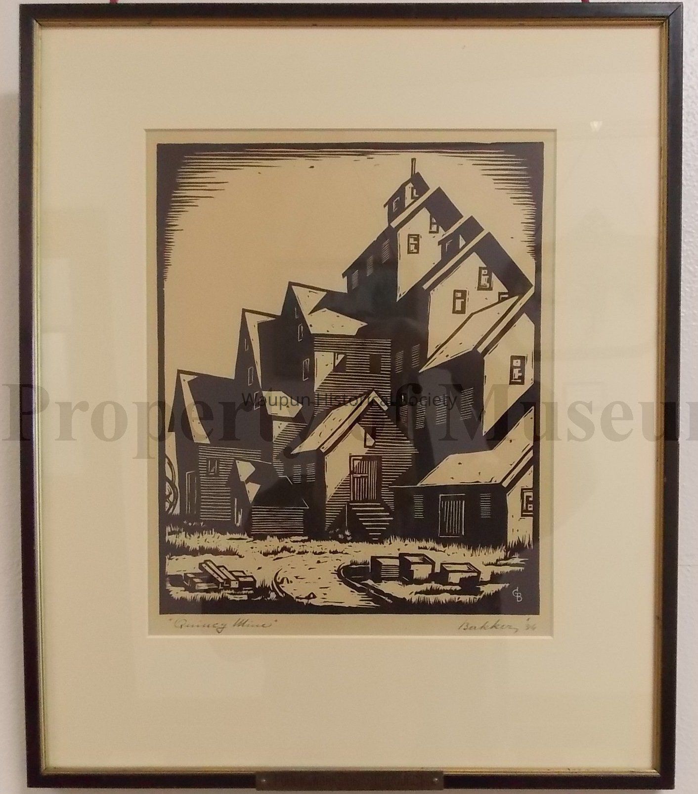 Wood block print, black on tan background, black frame, underglass, Quincy mining building by Gerhart Bakker.