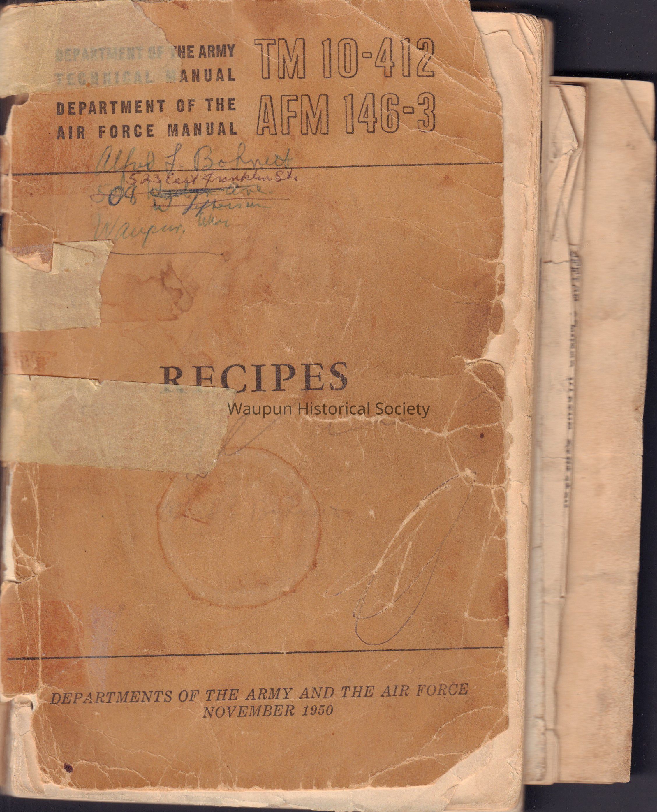 Recipes Book, Army & Air Force, Alfred Bohnert, WWII