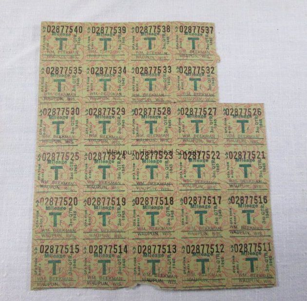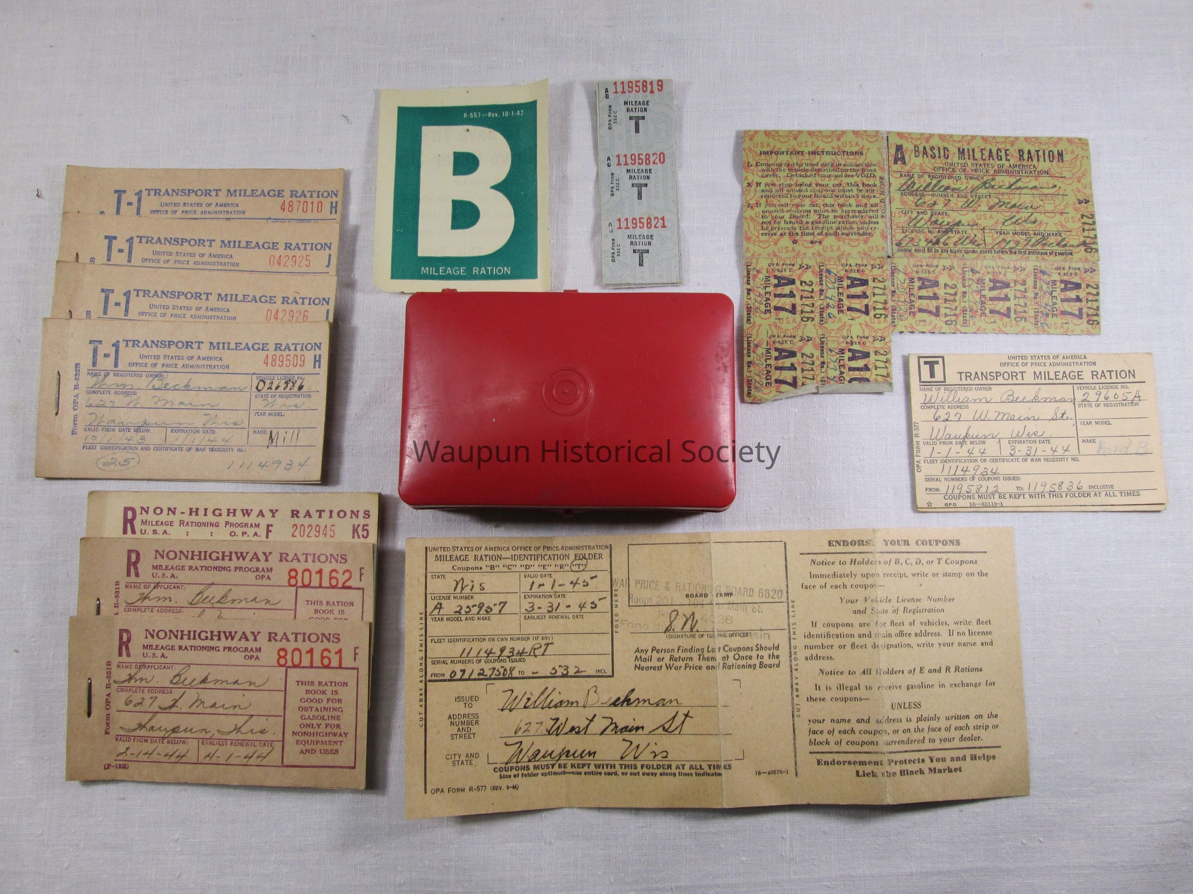 Red hinged plastic box containing books of ration tickets, 3 Nonhighway R Rations books, 4 T-1 Transport Mileage Ration books, Mileage Ration Identification Folder with instructions for use of rations, Rations Identification Card, Seven A17 Mileage Rations with Identification Card attached and 18 Mileage T Ration. One B Milage Ration Sticker.Acquisition