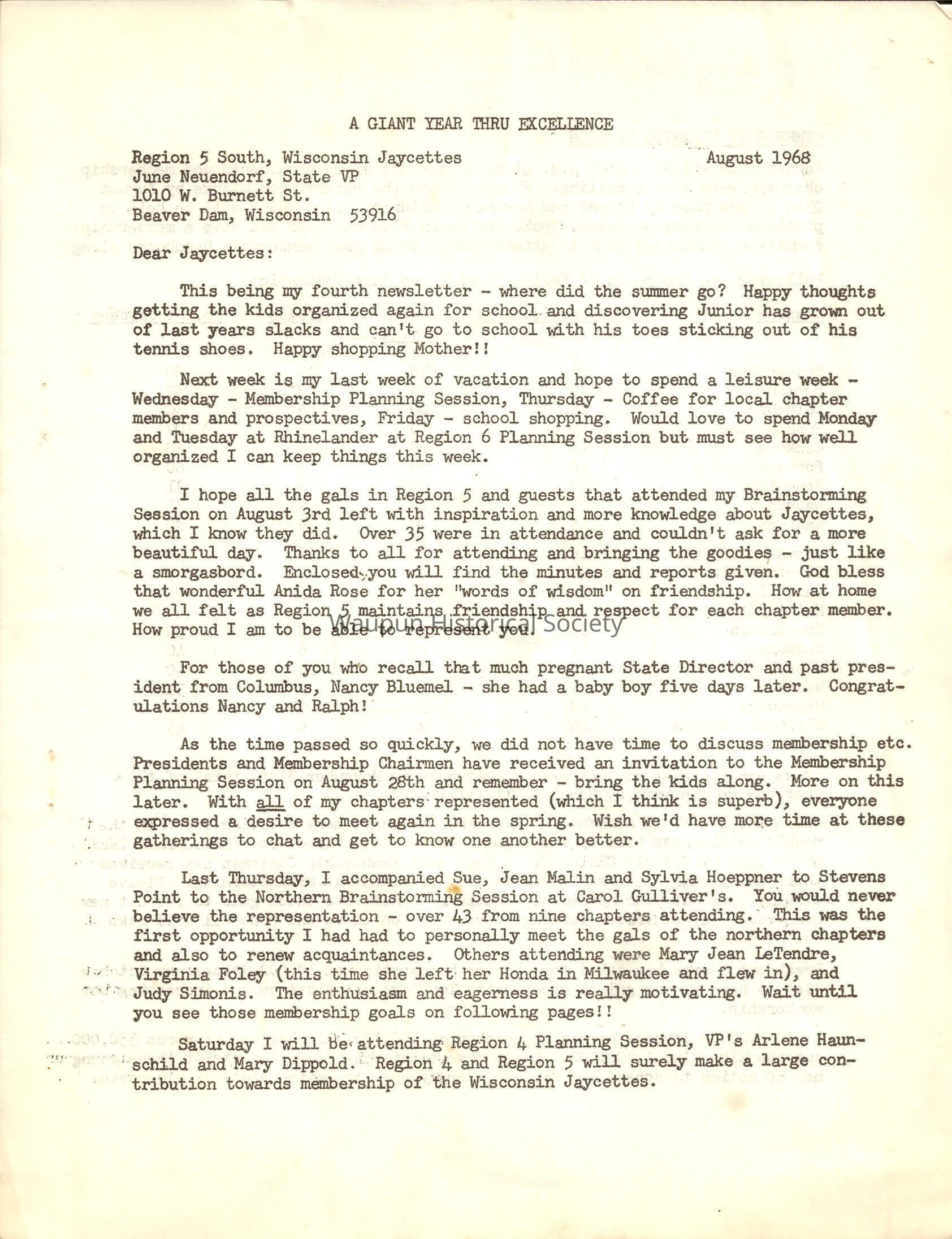 Region 5 Wisconsin Jaycettes monthly newsletter from August 1968. Sent to Waupun Jaycette member, Mrs. Diane Schiereck. Double sided typed pages, with green front and back covers, the newsletter was stapled together.