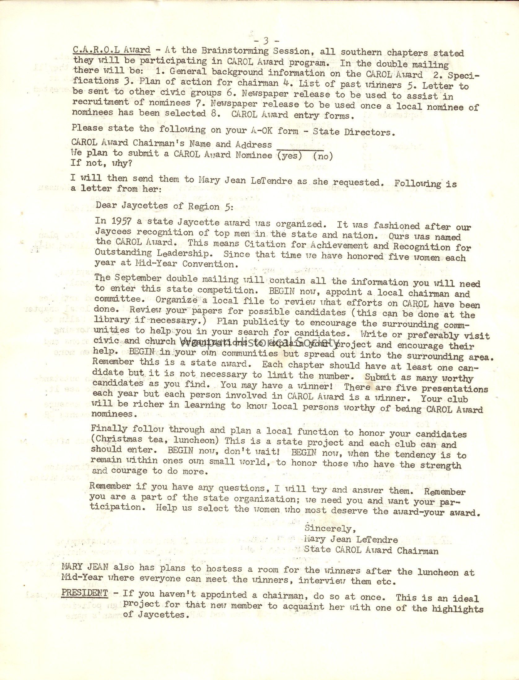 In 1957 a state Jaycette award was organized. It was fashioned after our Jaycees recognition of top men in the state and nation. Ours was named the CAROL Award. This means Citation for Achievement and Recognition for Outstanding Leadership. Since that time we have honored five women each year at Mid-Year Convention.