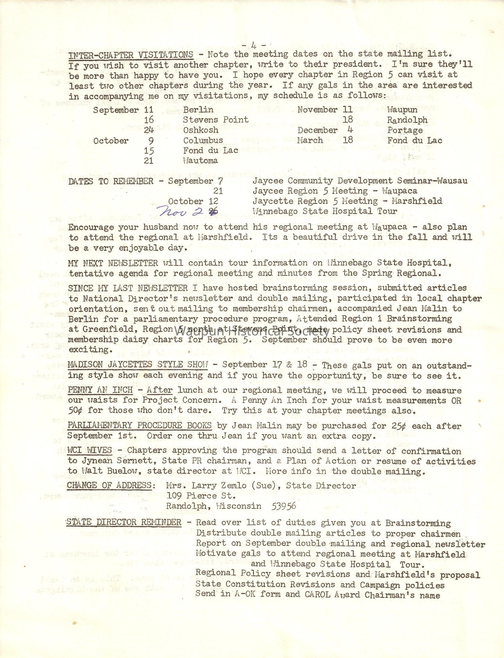 If you wish to visit another chapter, write to their president. I'm sure they'll be more than happy to have you. I hope every chapter in Region 5 can visit at least two other chapters during the year. If any gals in the area are interested in accompanying me on my visitations, my schedule is as follows: September 11 Berlin November 11 Waupun