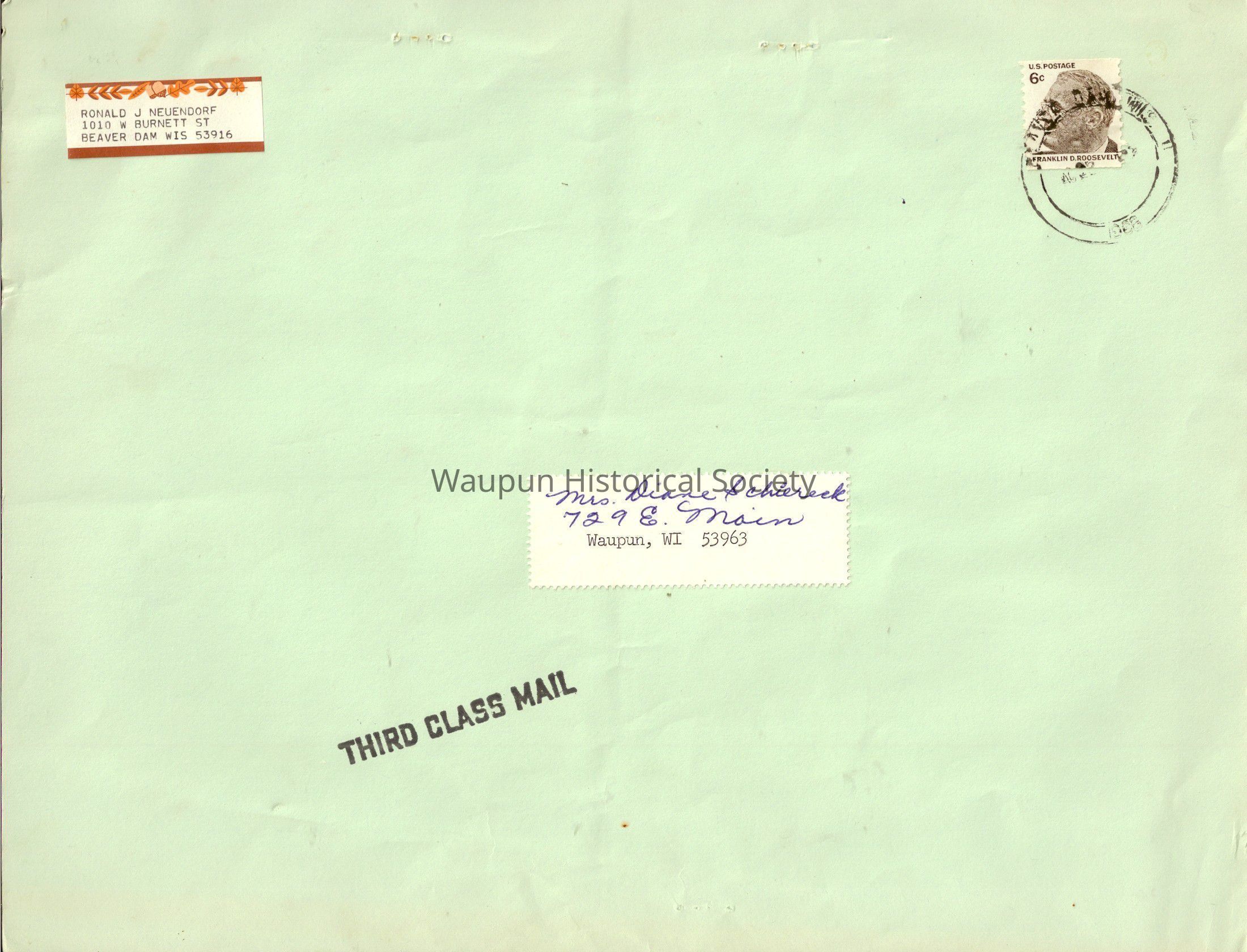 The back shows: THIRD CLASS MAIL at 6 cents postage. The return address indicates: Ronald Neuendorf, 1010 Burnette St. Beaver Dam, Wis 53916.