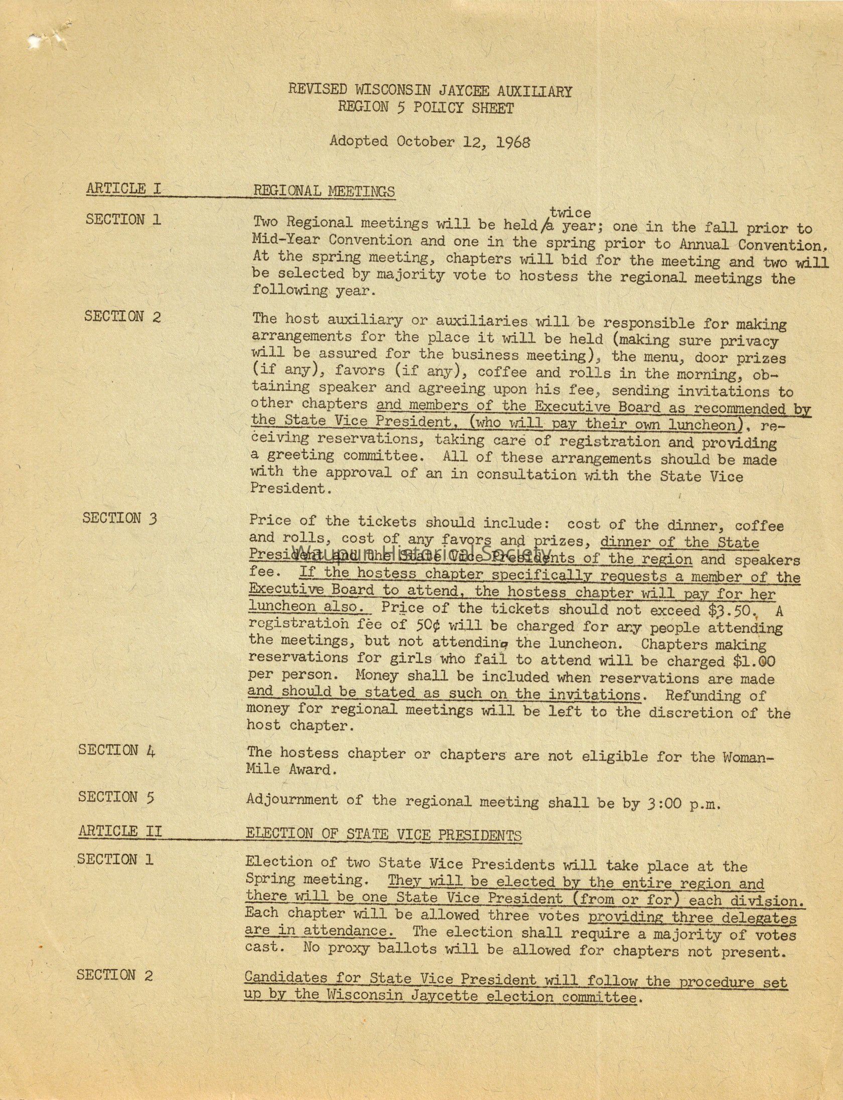 Three page document outlining the REVISED WISCONSIN JAYCEE AUXILIARY REGION 5 POLICY SHEET. Adopted October 12, 1968. Nine articals typed on heavy green paper(construction paper type) somewhat discolored over time.