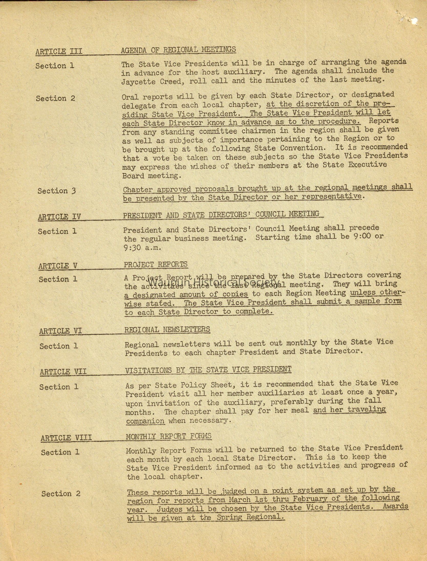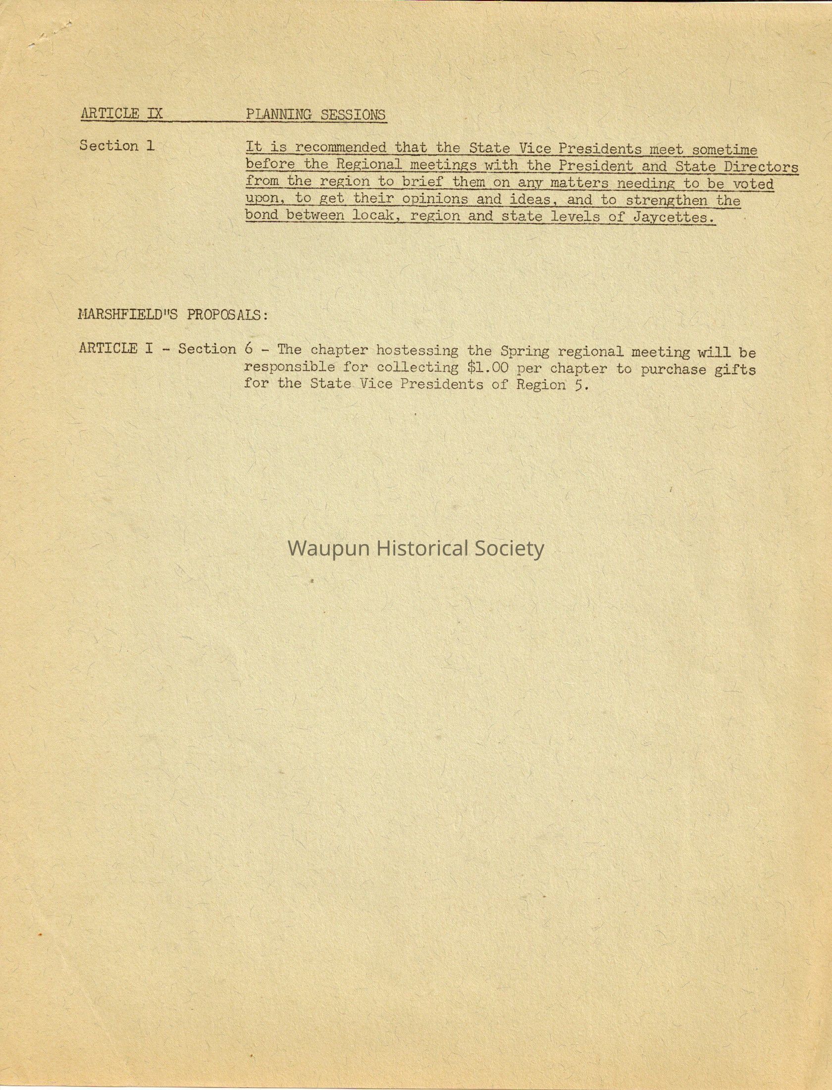 Section 1 It is recommended that the State Vice Presidents meet sometime before the Regional meetings with the President and State Directors from the region to brief them on any matters needing to be voted upon, to ger their opinions and ideas, and to strengthen the bond between locak (local), region and state levels of Jaycettes.
