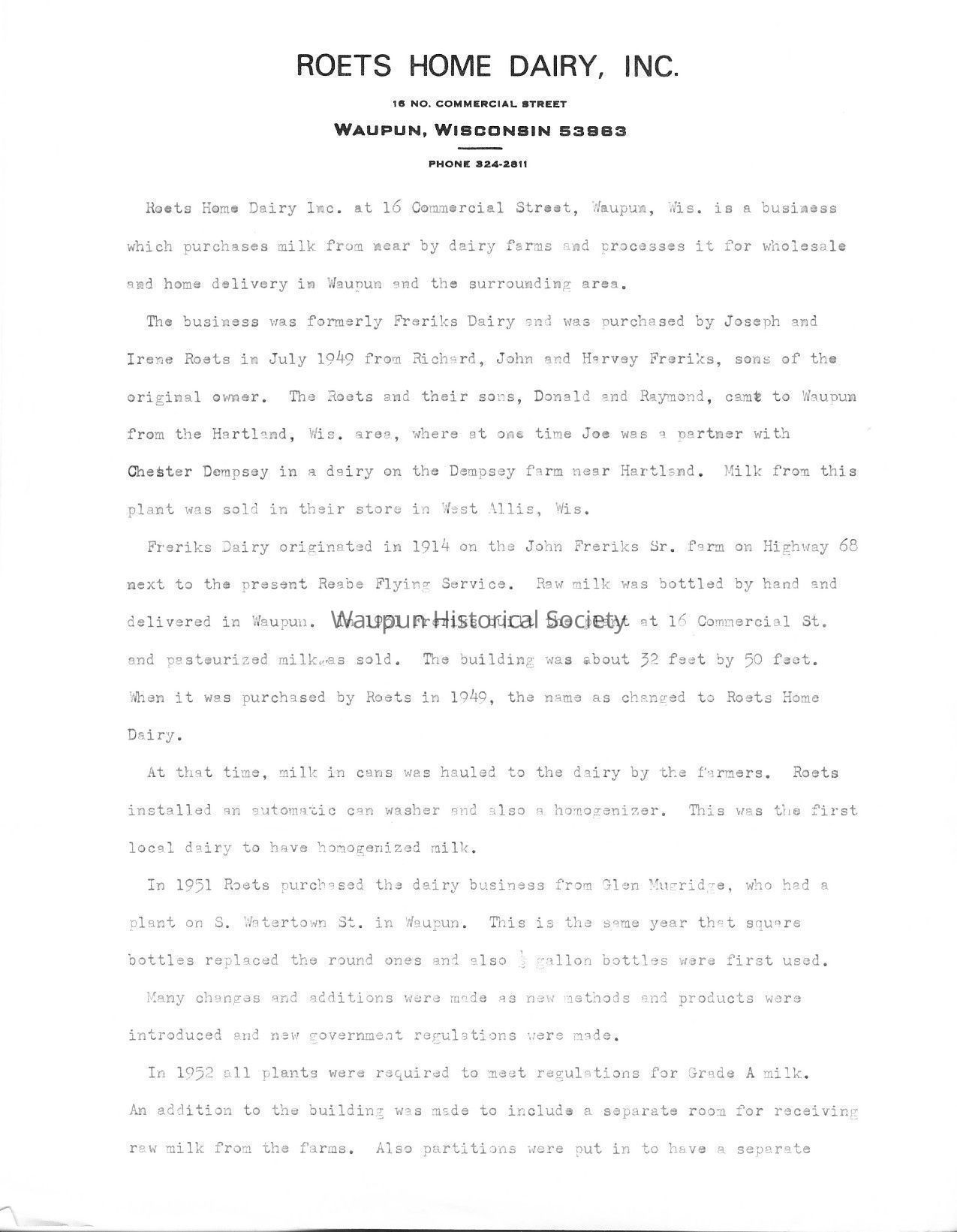 Freriks Dairy originated in 1914 on the John Freriks Sr. farm on Highway 68 next to the present Reabe Flying Service. Raw milk was bottled by hand and delivered in Waupun. In 1931 Freriks built the plant at 16 Commercial St. and pasteurized milk was sold. The building was about 32 feet by 50 feet. When it was purchased by Roets in 1949, the name as changed to Roets Home Dairy.