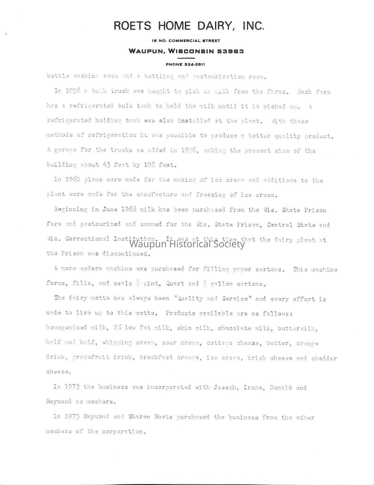 Historical information on Roets Home Dairy, Inc. for 1976 Bicentennial Celebration in Waupun, WI.