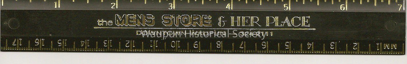 1 6" ruler from "the Mens (Men's) Store & Her Place, Downtown Waupun, 324-2111." These were clothing stores in towntown Waupun. They were located at 315 East Main Street. During part of their history the Her Place was in a different location. They were operated by several people.Acquisition