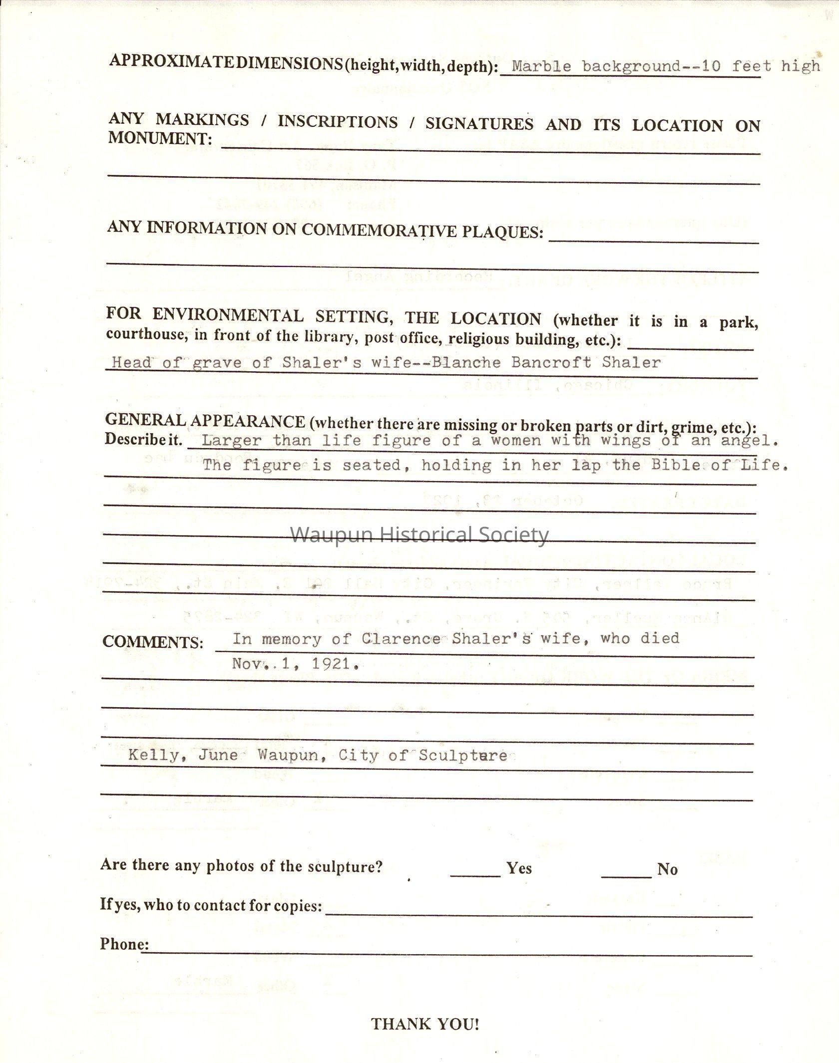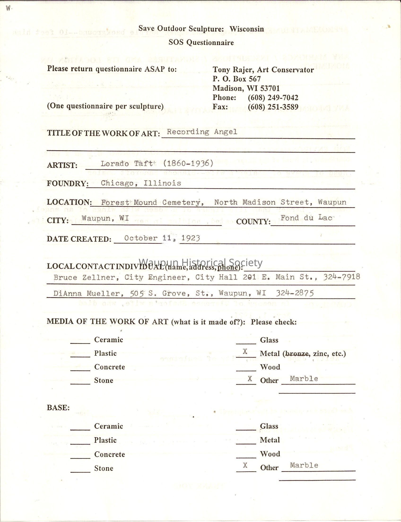 Questionnaire, Save Outdoors Sculpture, Recording AngelEntry/Object ID