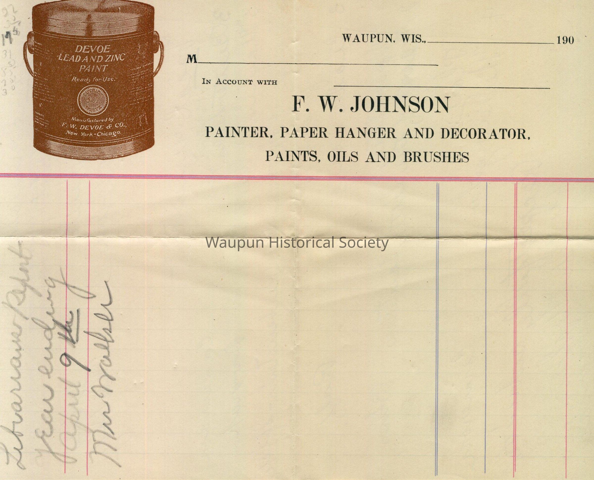 Bill of sale is dated Waupun, WIS., ___________, 190_ . It shows a can of paint for "DEVOE LEAD AND ZINC PAINT, Ready to Use. F. W. DEVOE & CO., New York, Chicago." A Fred W. Johnson was living at 527 E. Jefferson in 1910.