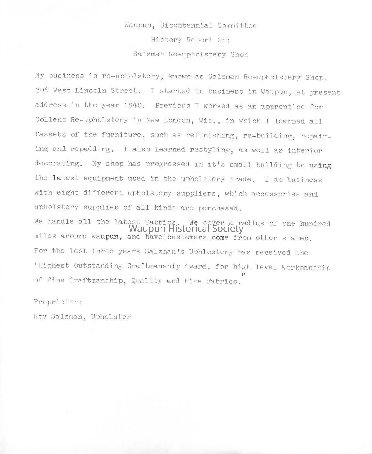 Historical information on Salzman Re-Upholstery Shop for 1976 Bicentennial Celebration in Waupun, WI.