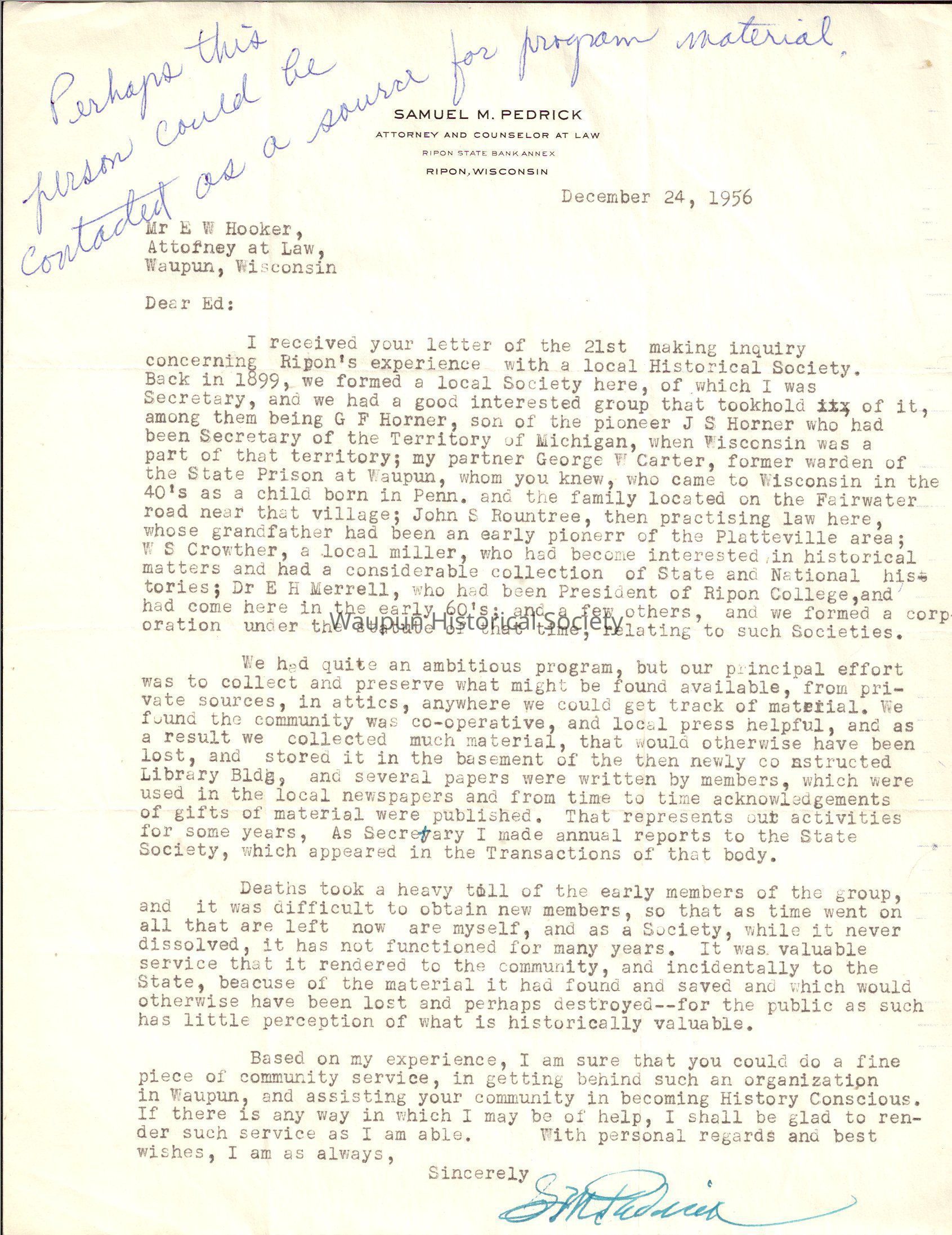 A Letter about Back in 1899, they had formed a local Historical Society at that time he was Secretary and has several interested groups that took hold of an quite ambitious program but our principal effort was to collect and preserve what might be found from private sources and public has little Perception of what is historically valuable.Acquisition