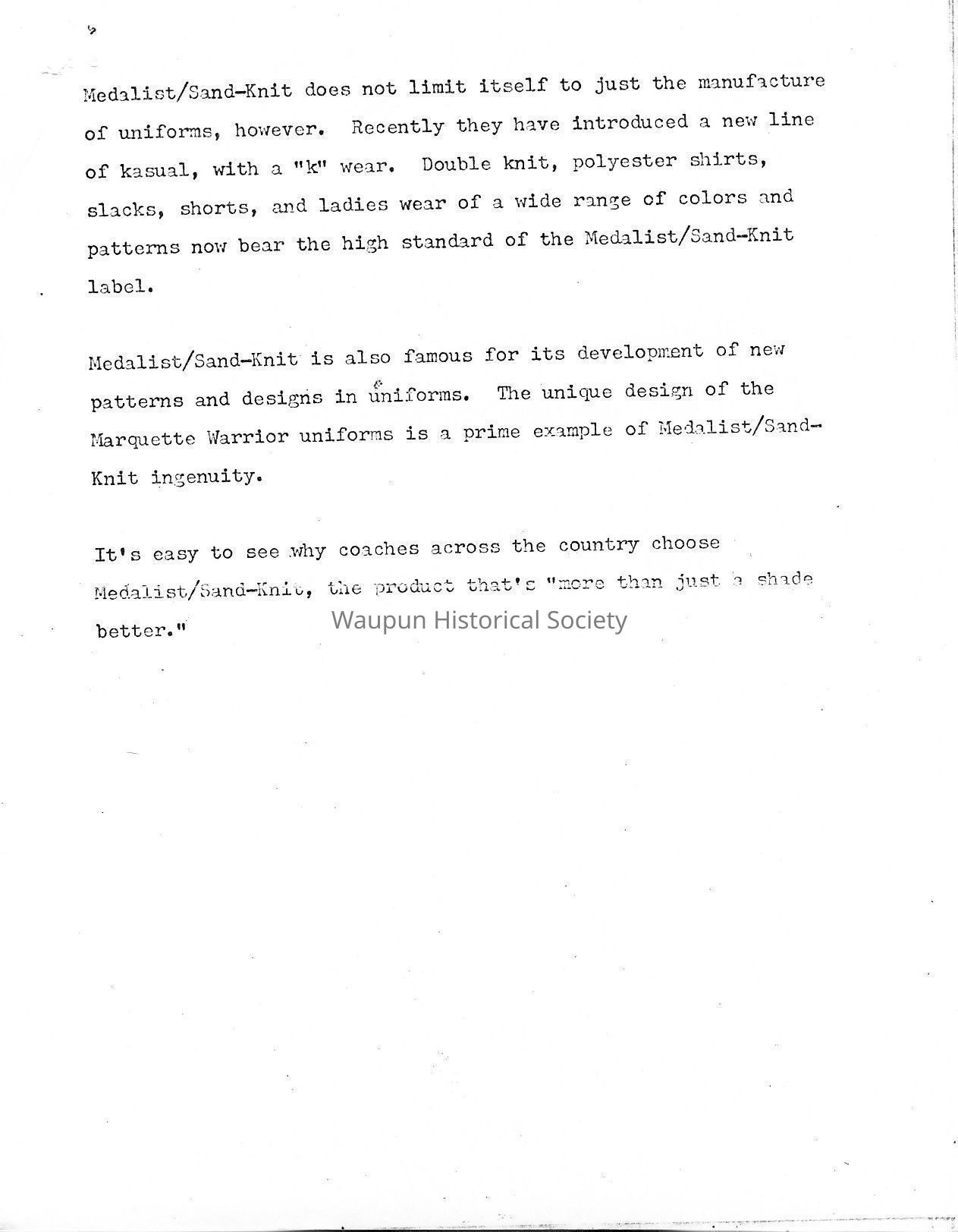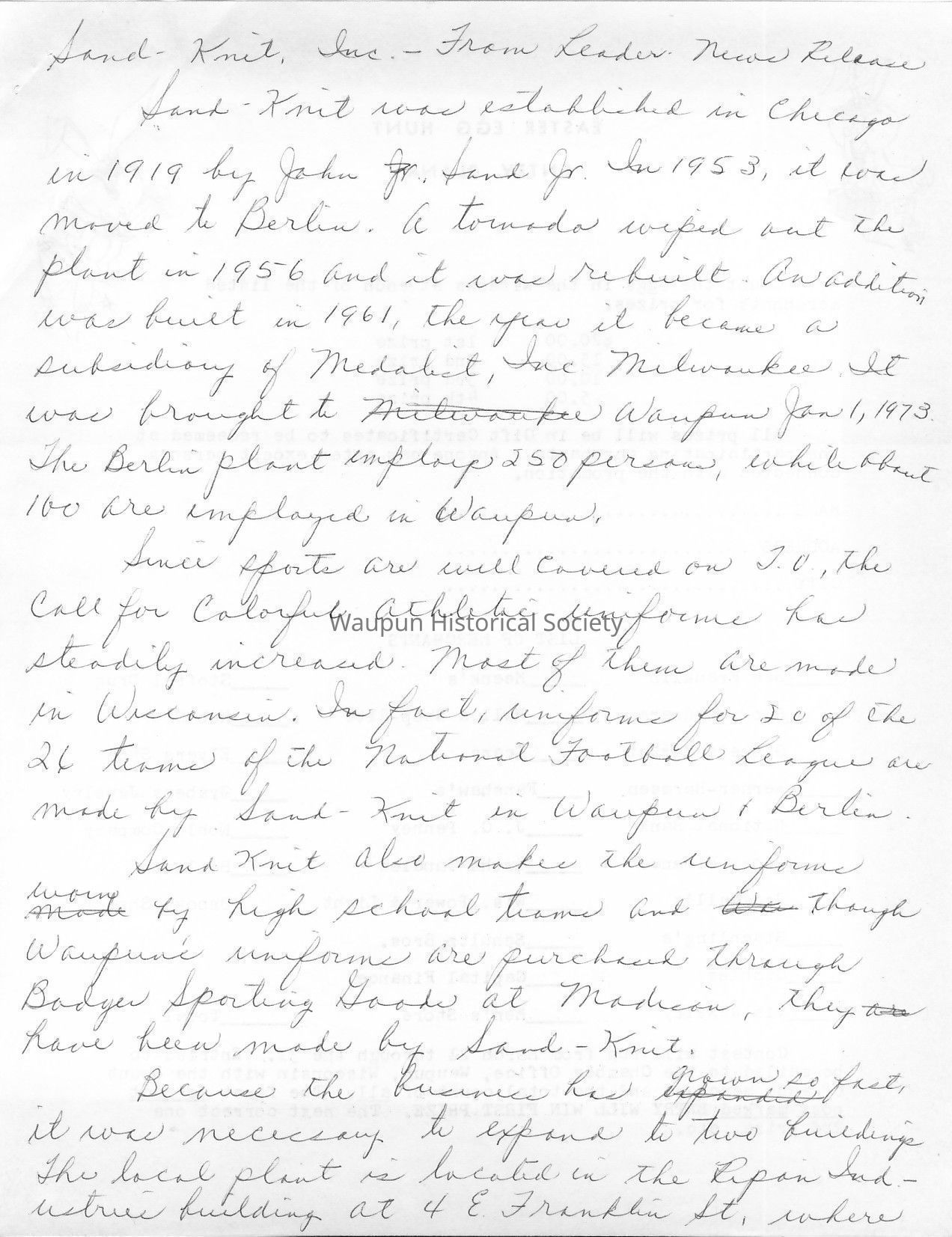 Sand-Knit was established in Chicago in 1919 by John Sand Jr. In1953, it was moved to Berlin. A tornado wiped out the plant in1956 and it was rebuilt. An addition was built in 1961, the year it became a subsidiary of Medalist, Inc. Milwaukee. It was brought to Waupun Jan. 1, 1973. The Berlin plant employs 250 persons, while about 100 are employed in Waupun.