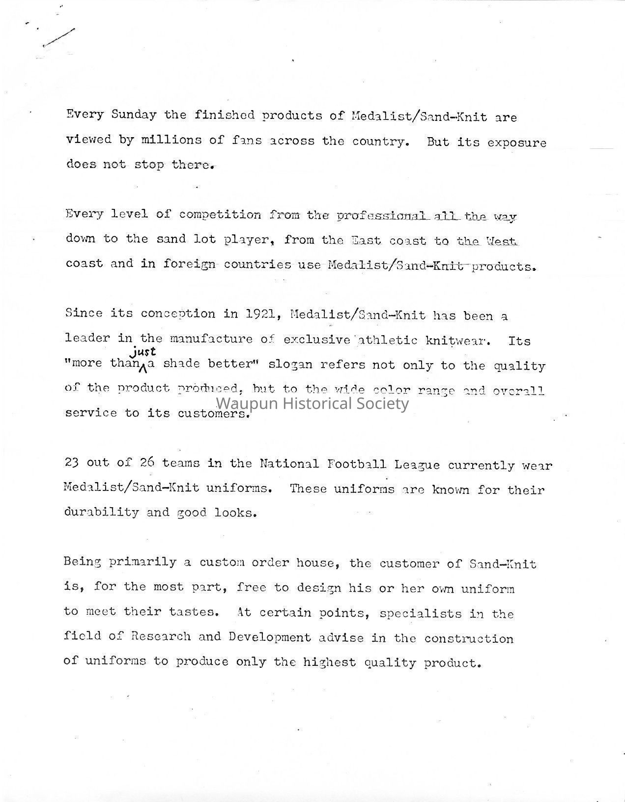 Since its conception in 1921, Medalist/Sand-Knit has been a leader in the manufacture of exclusive athletic knitwear. Its "more than just a shade better" slogan refers not only to the quality of the product produced, but to the wide color range and overall service to its customers.