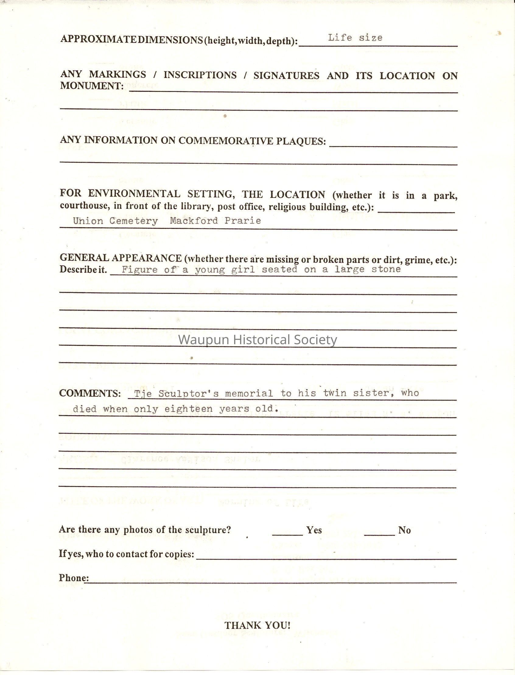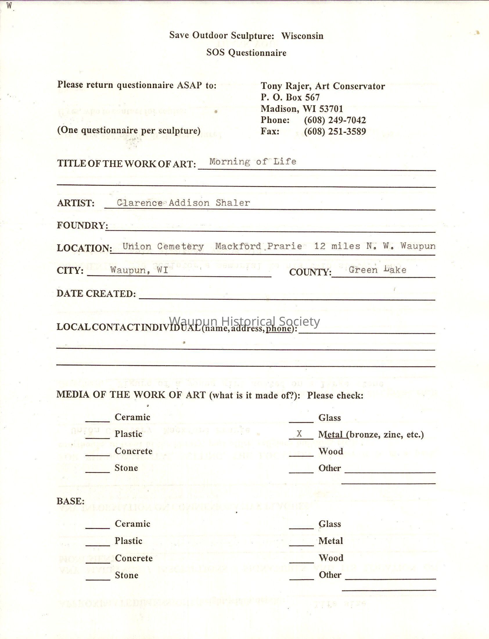(One questionnaire per sculpture) Fax: (608) 251-3589