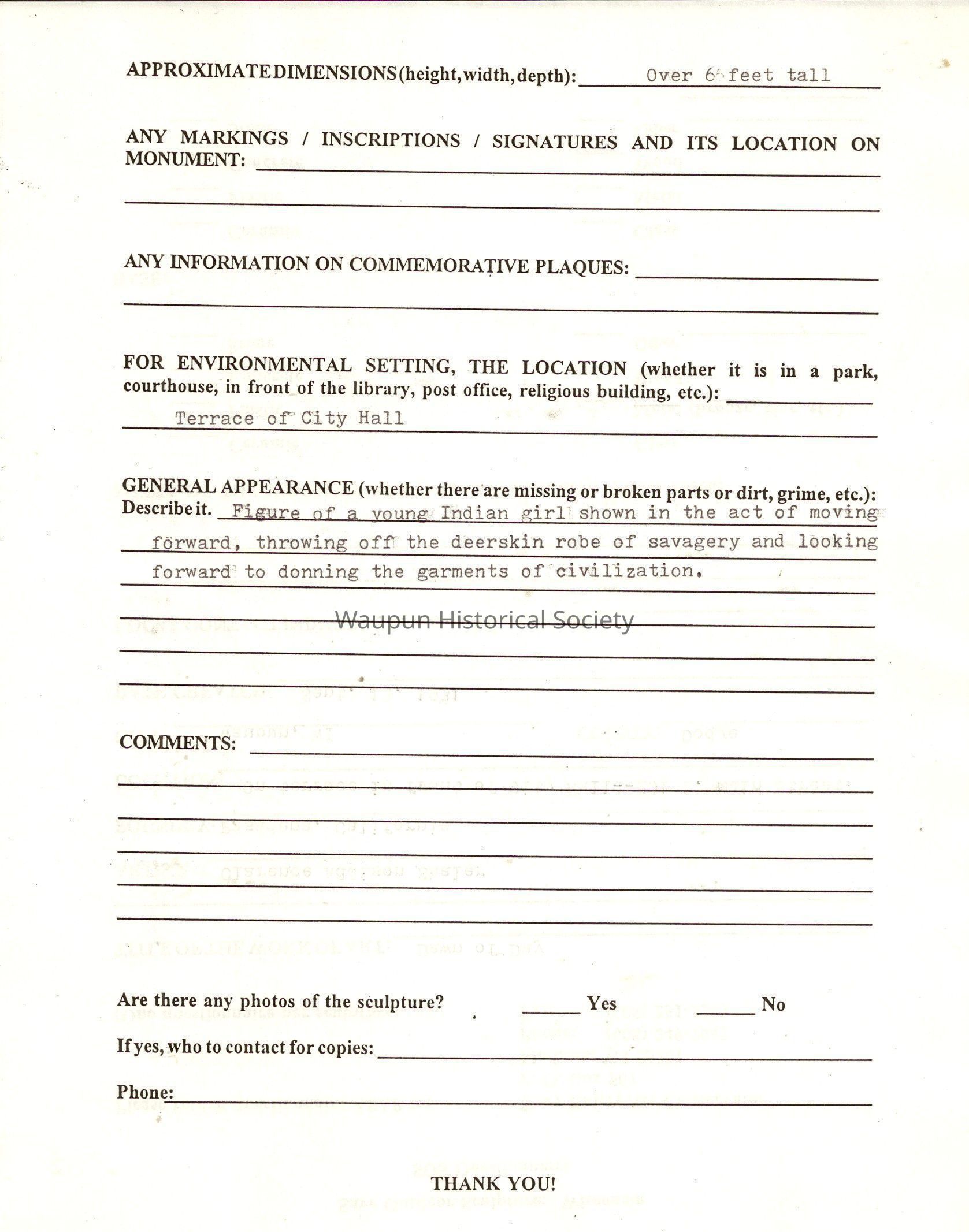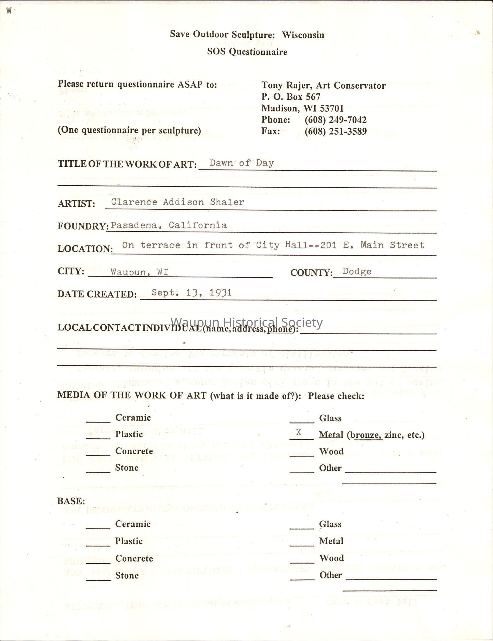 Questionnaire, Save the Outdoors Sculpture, Dawn of DayEntry/Object ID