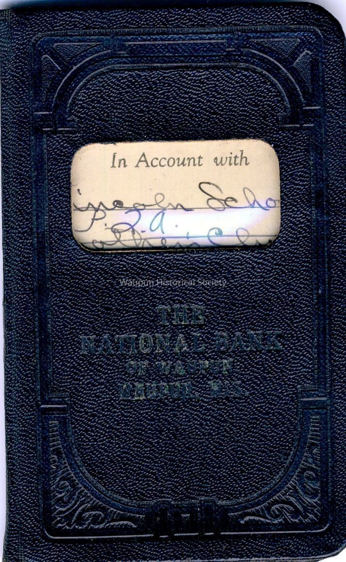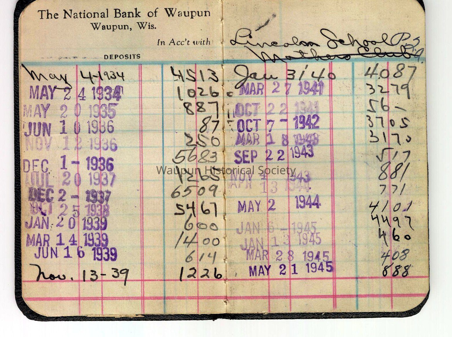 National Bank of Waupun. This is a picture of a 1 1/2 x 4 bank account book for the Lincoln School Mother's Club.