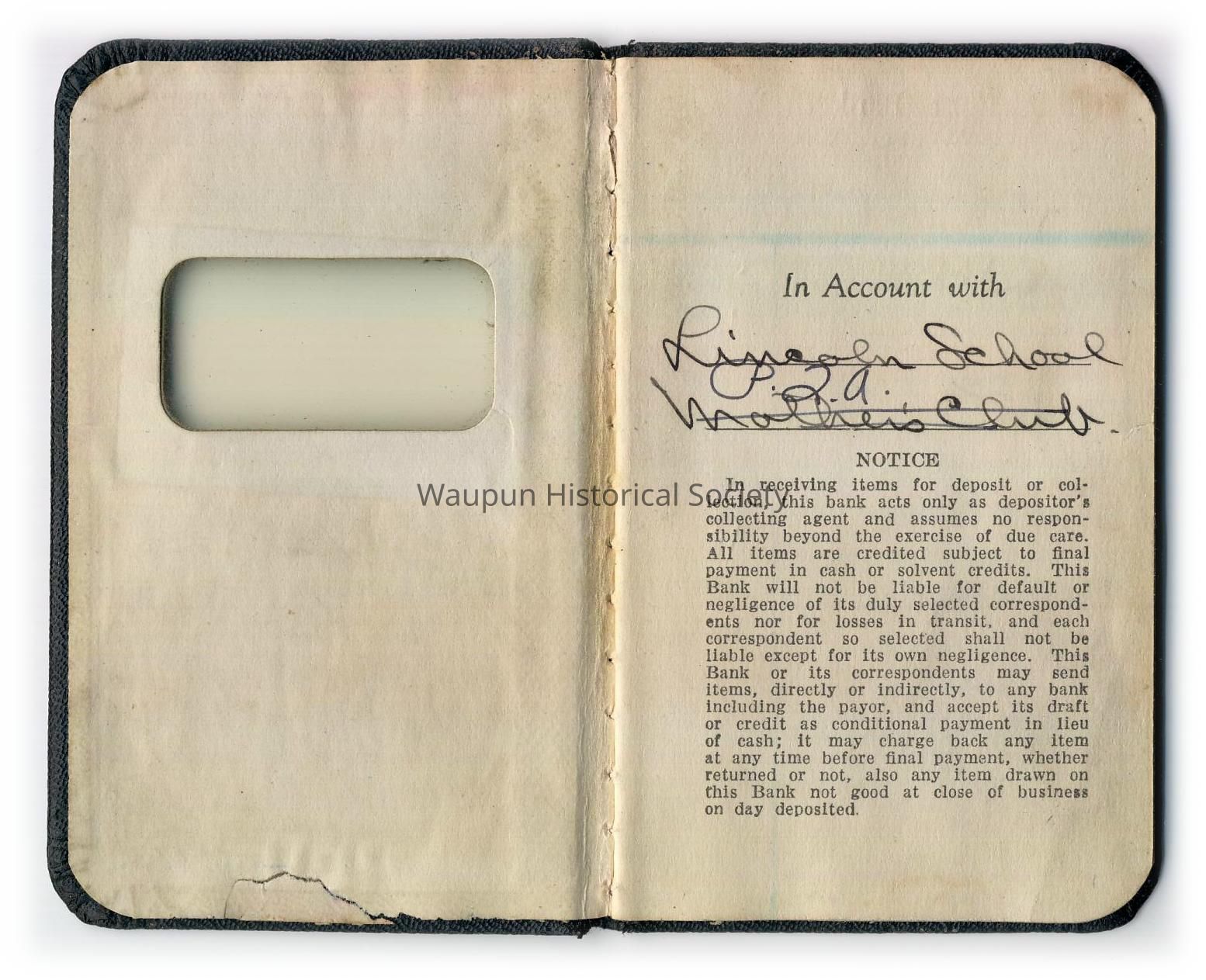 Savings Book, National Bank of Waupun, Lincoln School Mother's ClubEntry/Object ID