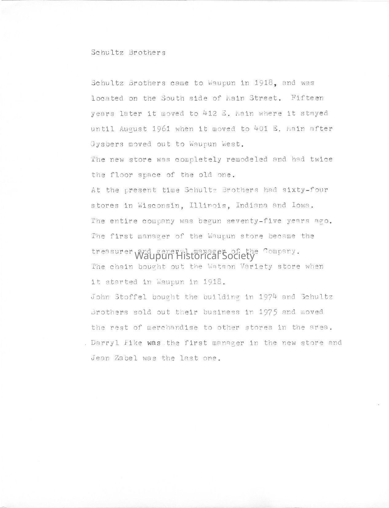 Schultz Brothers came to Waupun in 1918, and was located on the South side of Main Street. Fifteen years later it moved to 412 E. Main where it stayed until August 1961 when it moved to 401 E. Main after Gysbers moved out to Waupun West.