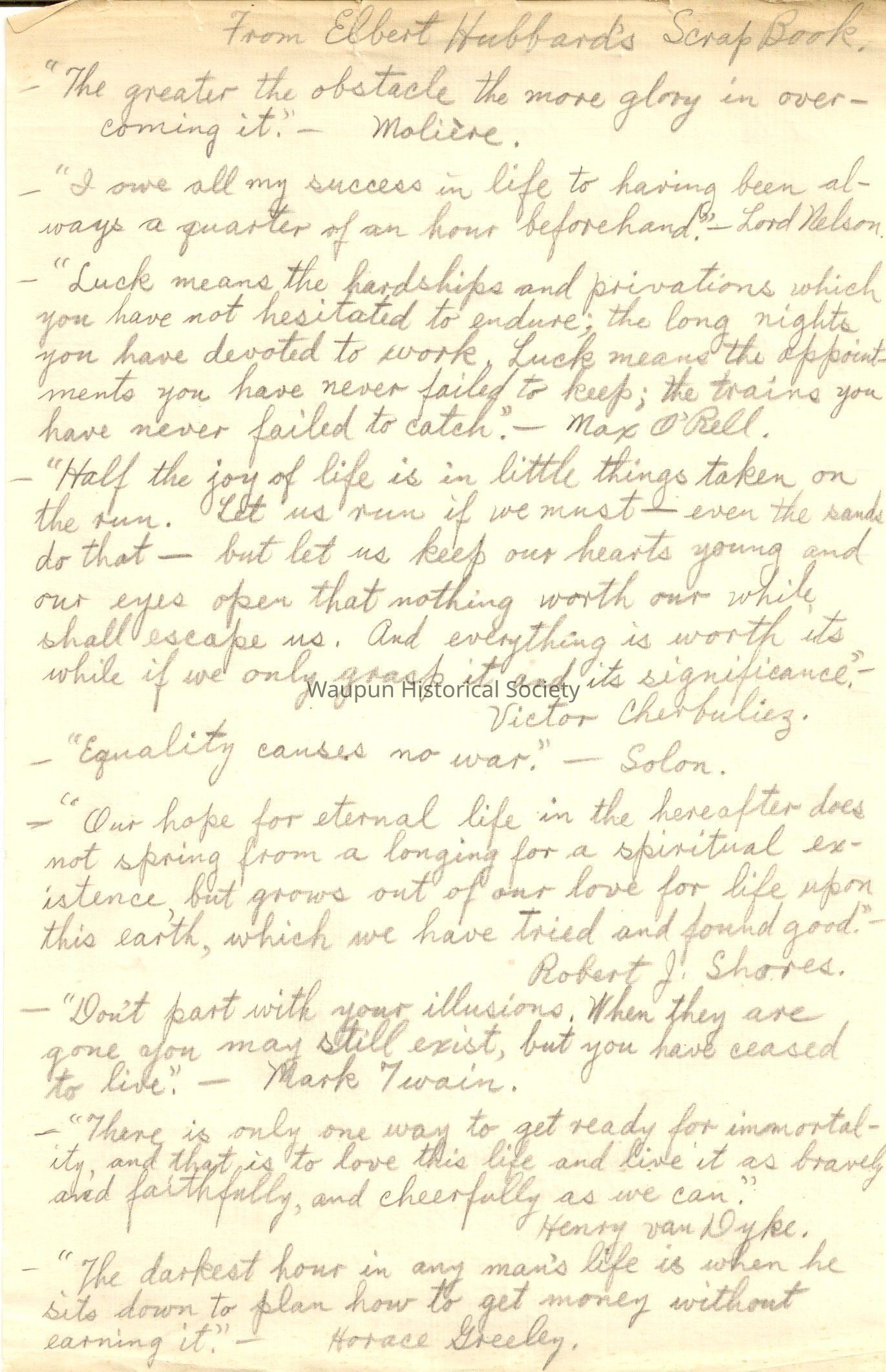 Selections from the Elbert Hubbard Scrap Book. Hand written on both sides in pencil, writer unknown. Twentyfour quotes of multiple authors.