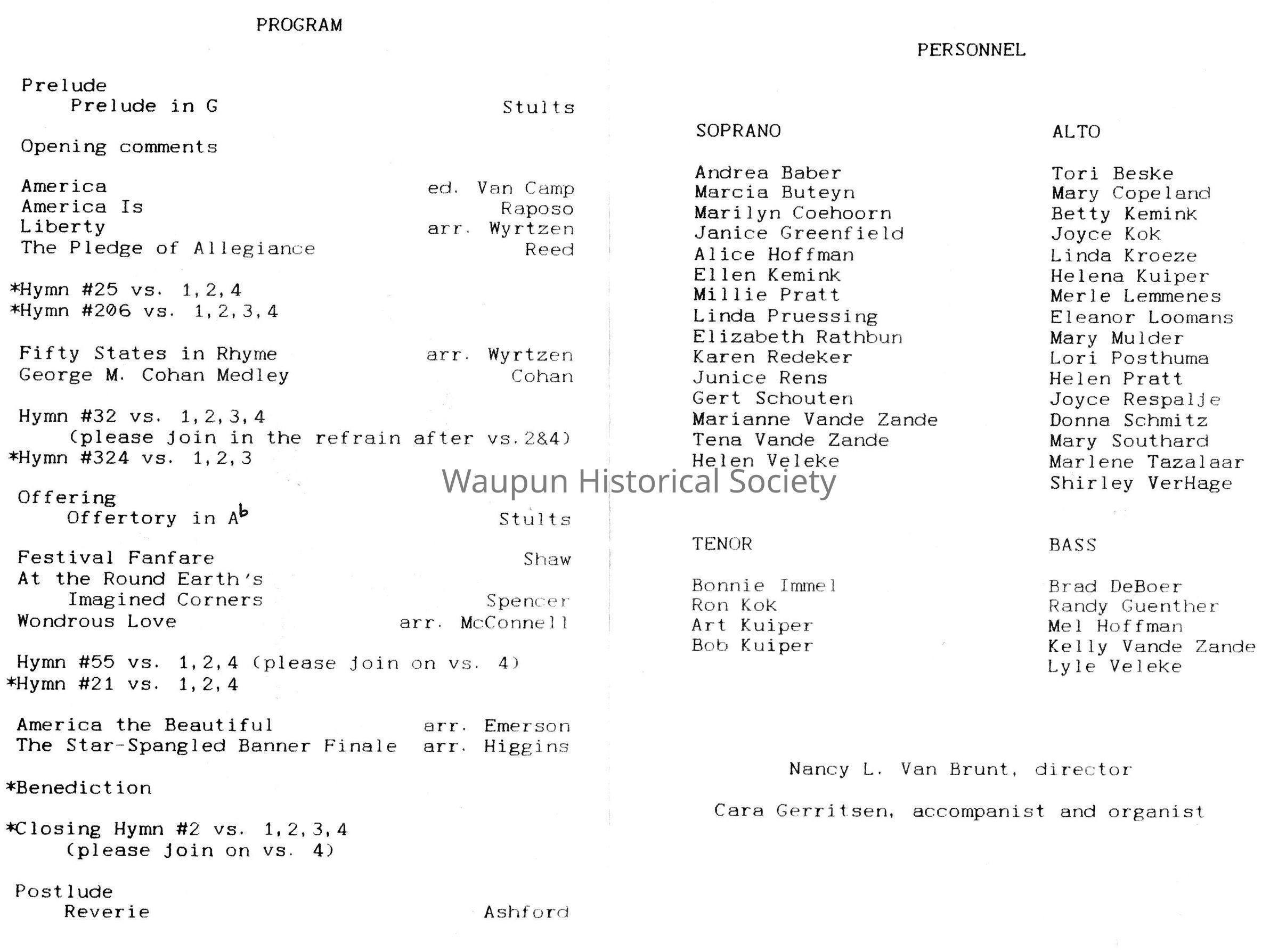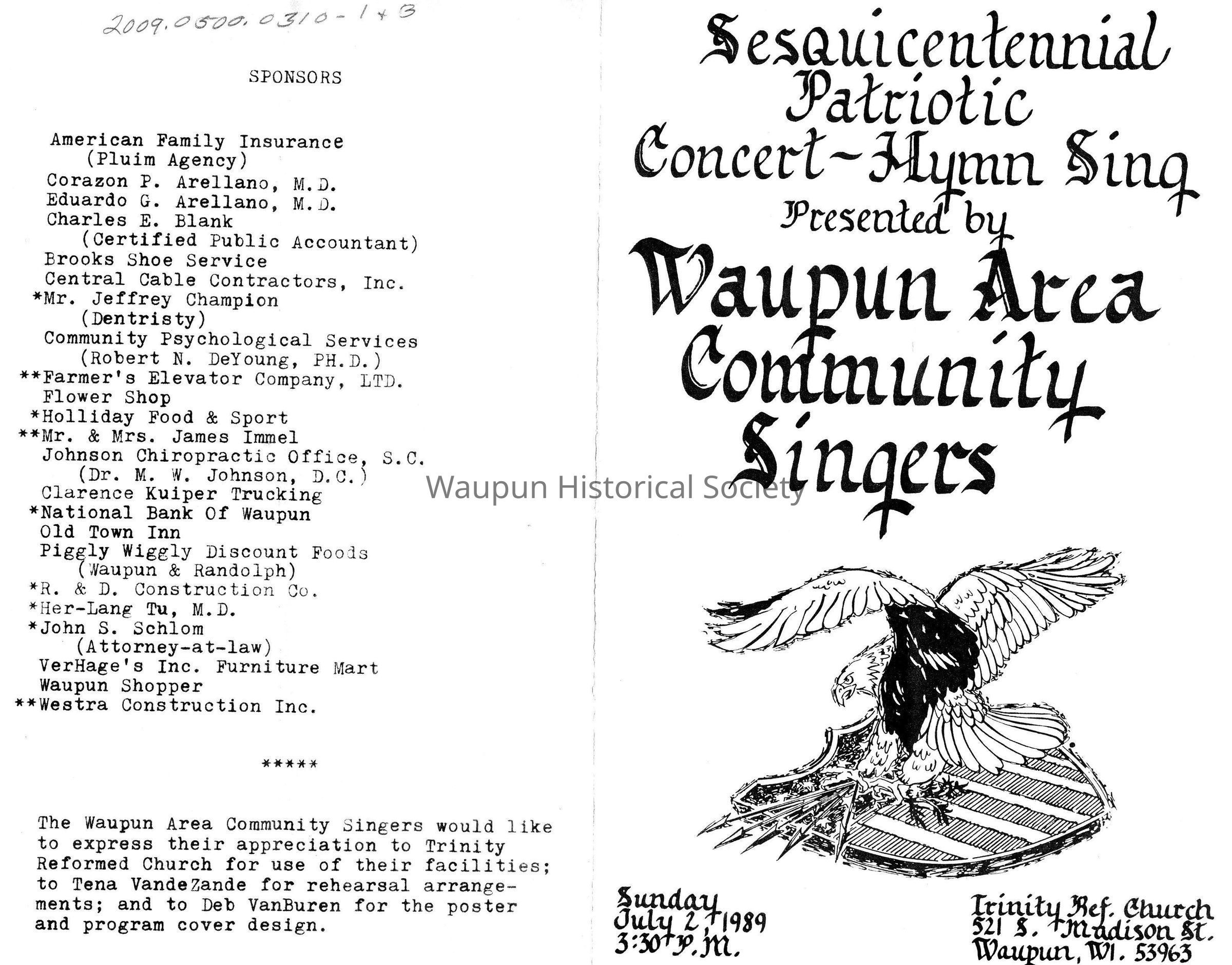 The Waupun Area Community Singers would like to express their appreciation to Trinity Reformed Church for use of their facilities; to Tena VandeZande for rehearsal arrangements; and to Deb VanBuren for the poster and program cover design.