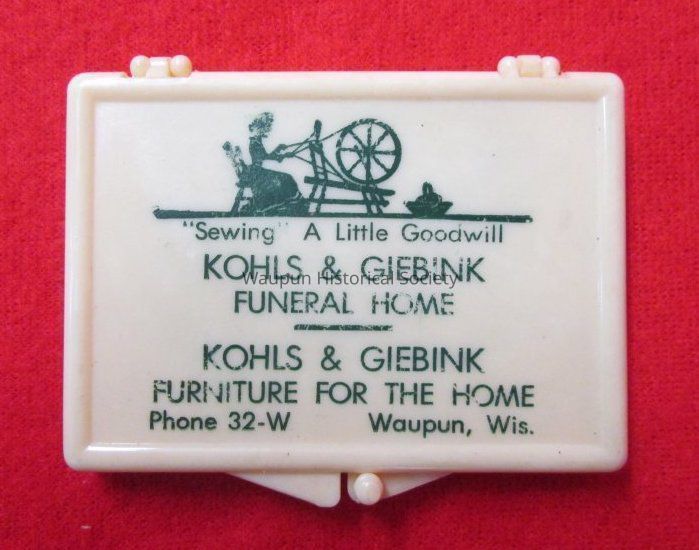"Sewing a llittle goodwill" is a promotional sewing kit from KOHLS & GIEBINK Funeral Home - KOHLS & GIEBINK Furniture. The year this would have been issued is pre "dial phone and zip code" which would make it early 1960's and before. The phone number is shown as 32-W and the address is Waupun, Wis.