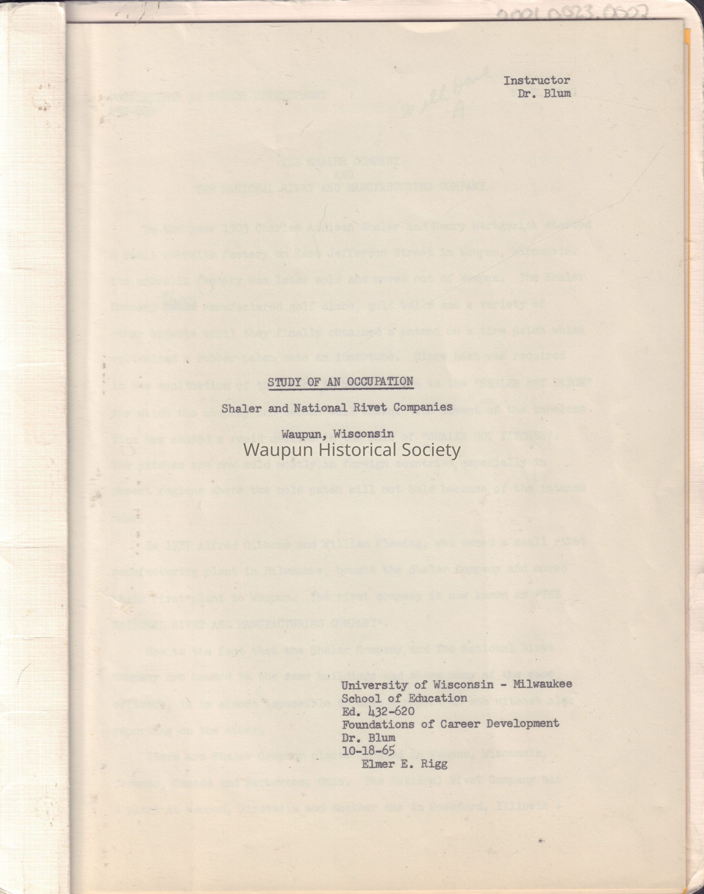 Shaler, Paper written by Mr. Rigg for a class in "Foundations in Career Development." This paper is dated December 6, 1965